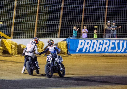 worked my whole life to be here.” While ultimately unable to overcome Daniels’ peerless consistency, Bauman closed out a spectacular season that only further enhanced the reputation of the two-time Grand National Champion. In ‘25, Bauman and his Rick Ware Racing team took the previously winless Harley-Davidson XG750R and won more races than any other rider this season (eight) while giving Daniels and the Estenson Racing squad all they could handle until the very end. Bauman said, “I’ve got to give a huge thanks to the Rick Ware Racing/Parts Plus/Latus Motors team. I ask so much of these guys. We had high hopes and a lot of heart. Congrats to Dallas Daniels and the whole Estenson Racing team. They are so good. This was the best year of my career statistically, and it wasn’t good enough. That’s crazy.” Daniels won the 2025 Mission AFT SuperTwins title with 313 points. Bauman ended up second with 307, followed by Robinson at 217. Meanwhile, Lowe secured Mission AFT SuperTwins Rookie of the Year honors by finishing a superb fourth overall with 186 points. Briar Bauman (3) and Dallas Daniels (32) congratulate each other immediately following the Mission AFT SuperTwins Main Event Saturday night. [Photo: American Flat Track / Tim Lester] AFT Singles presented by KICKER While Tom Drane (No. 59 Estenson Racing Yamaha YZ450F) locked up the 2025 AFT Singles presented by KICKER title two rounds early, there was still much in play at the ‘25 finale. Even with the remainder of the field seeking both personal milestones and momentum to carry into the offseason, Drane continued to own the spotlight. However, earlier in the contest, the rider of ‘25 found himself chasing a couple of riders of the future. Second-year pilot Bradon Pfanders (No. 83 Hannum’s HD/Pfanders Racing KTM 450 SX-F) took the early advantage before being displaced by rookie ace Kage Tadman (No. 288 1st Impressions Race Team Husqvarna FC450). At half-distance, newly crowned champ Drane switched up his line, cutting down low entering Turn 1 and making up big chunks of ground in the process. Once in striking distance, he used the same line to dive under Pfanders to take control of second before attempting to do the same to Tadman in first. The Californian had an answer the first time around, squaring Drane back up to reclaim the lead. However, the Estenson Racing star made it stick on his second attempt. A curveball was thrown moments later in the form of a red-flag reset with just 59 seconds remaining on the clock following a crash on the part of Trevor Brunner (No. 21 American Honda/Mission Foods CRF450R). Even though that development put Tadman back out in front for the staggered restart, Drane immediately slung it low entering Turn 1 to snatch the lead right back. The restart still had significant implications as it thrust a previously quiet Tarren Santero (No. 75 Mission Roof Systems Honda CRF450R) back into the fray near the front. Given new life, Santero nudged ahead of Tadman to take over second. He then subsequently gave Drane a scare to the checkered flag before finishing as the race’s runner-up. Drane’s victory closed out his historic ‘25 campaign with a record-tying eighth win on the season, equaling the previous best marks of Dallas Daniels and Kody Kopp. It also represented his 19th-career win in the class, tying him with Shayna Texter-Bauman for second all-time. His victory also sealed the 2025 AFT Singles Manufacturer crown for Yamaha. Afterward, Drane said, “I can’t thank my whole Estenson Racing Monster Energy team enough. They worked their butts off all year and gave me a great bike. That race, I got to the front earlier, but for the restart, I had to reset my mind. I had to get out there, get the start, and take the lead as quick as I could. Once I was there, I felt I could lead and be comfortable at the front. It was really good.” Tadman held on for third, with Pfanders and Chad Cose (No. 49 1st Impressions Race Team Husqvarna FC450) completing the top five. As a result of tonight’s order, Tadman and Santero ended the season equal with 175 points apiece in their battle for fourth in the final rankings, trailing only the previously decided 1-2-3 of Drane, Brunner, and Chase Saathoff (No. 88 RWR/Parts Plus Honda CRF450R). That position ultimately went to Tadman via the tiebreaker due to his race-winning Progressive AFT debut. Build. Train. Race. Royal Enfield’s Build. Train. Race. (BTR) program, which serves to highlight, celebrate, and encourage the involvement of women in flat track racing, closed out its 2025 season with a double finale at Lake Ozark Short Track. Main Event 1 saw Madicela Rodriguez (No. 113 Royal Enfield/Parts Unlimited) fend off Taia Little (No. 11 Royal Enfield/Parts Unlimited) by a narrow 0.009 seconds at the checkered flag with Emma Gottsch (No. 5 Royal Enfield/Parts Unlimited) less than a second in arrears in third. Little got her revenge in Main Event 2, shaking loose to win ahead of Gottsch and Rodriguez and secure the 2025 BTR championship. |