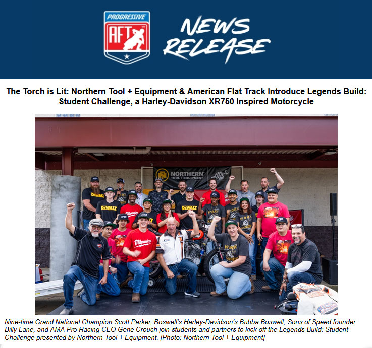 mentorship of legendary racers and builders. Only knowing they’d been selected for the project, but not knowing what they’d build, students were surprised to see legend Scott Parker ride in on a XR750 flat track bike, revealing they’d have 174 days to build a race-ready version themselves. This challenge shines a spotlight on one of America’s most iconic and untamed racing traditions: American Flat Track. It’s fast. It’s fearless. It’s raw mechanical mastery on two wheels. “We were sure it was going to be a sprint kart. When they told us we’d be building a race bike, it blew our minds. It’s insane,” said one student builder. The students won’t be alone on this build; they will learn directly from some of the most respected names in racing and fabrication: Scott Parker, Chris Carr, Kenny Coolbeth Jr., Billy Lane and many more! “The students had their theories—some of them pretty wild—and they were all wrong,” added Jason Bowers, the CTE teacher leading the class. “When we saw Scott Parker ride up on a flat track race motorcycle, we stood there with our jaws open. Our brains started spinning with questions forming. Now, we’re starting to realize just how tough this sport is—and how much the motorcycle we’re building matters to a racer’s success.” To help the students get started, Northern Tool + Equipment, along with partners, American Flat Track, Bubba Boswell, Boswell’s Harley-Davidson, DEWALT, Harley-Davidson Motor Company and Milwaukee have decked out the school’s shop class with tens of thousands of dollars in donated tools, equipment, parts and safety gear. “At Northern Tool, we believe in putting tools in hands and confidence in hearts. The Legends Build is more than a motorcycle - it’s a demonstration of how much the trades matter, that they’re rewarding and that the next generation can carry this torch forward,” said Frank Crowson, Chief Marketing Officer, Northern Tool + Equipment. “I love everything about this program and this project, including the fact that this year the torch will be carried by our first female build captain!” The project is part of a growing legacy of trades-focused challenges created by Northern Tool + Equipment alongside icons of motorsport and fabrication. In 2023, Northern Tool partnered with NASCAR Legend Richard Petty and Billy Lane’s Sons of Speed to introduce students to the art of building and racing, bringing national attention to the program. This year, that tradition continues— and grows—with former NASCAR Racer Kyle Petty also lending his support. “Racing builds character, but building the bike builds a future,” said Kyle Petty, racing legend and host of the YouTube series following the students throughout the build. Fans, families and future tradespeople can subscribe to Northern Tool’s YouTube channel for monthly updates from the school’s shop. For the first time ever, the story will also be told through the eyes of the students. Armed with cameras, they’ll capture the highs, lows, mistakes, inside jokes and breakthroughs of the build. Watch for student-created updates on social media. The final bike will be revealed on June 6th at Tennessee National Raceway in an American Flat Track Legends exhibition race. After the race, the bike will be auctioned with the proceeds benefiting the Tools for the Trades™ program, Kyle Petty’s Victory Junction nonprofit and the AMA Motorcycle Hall of Fame. |