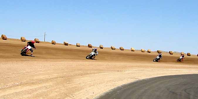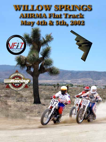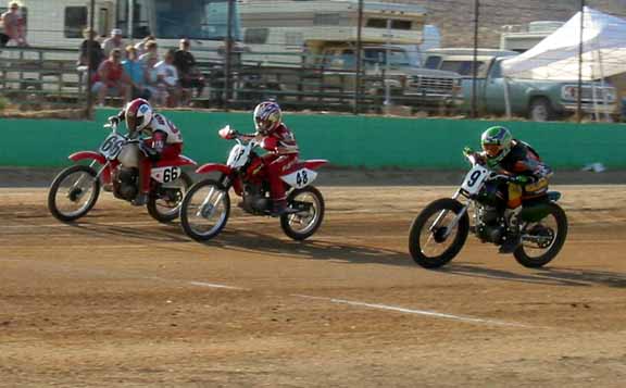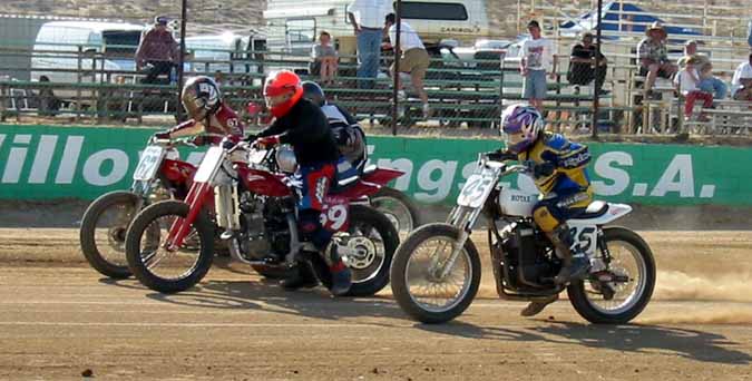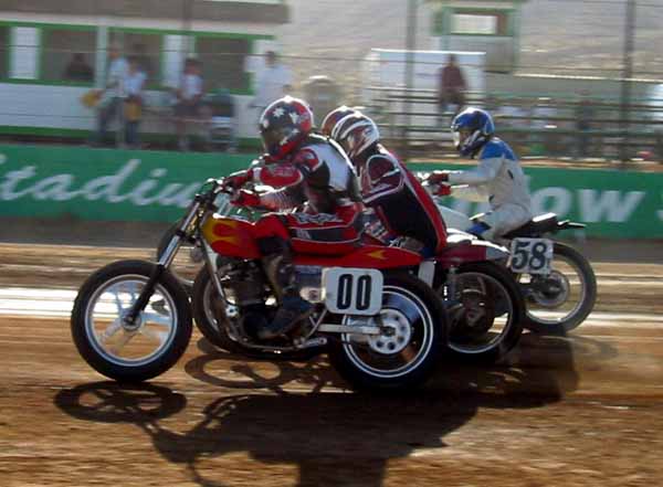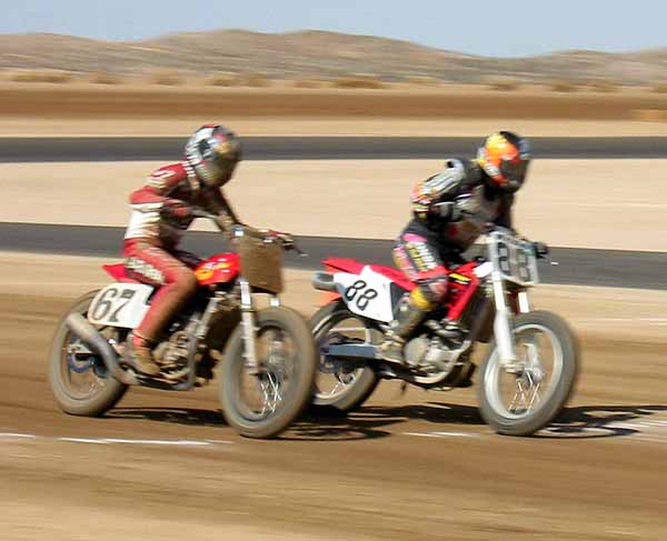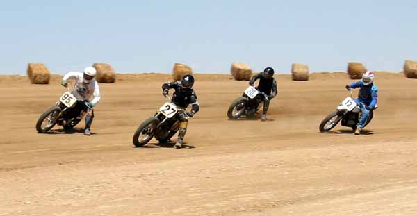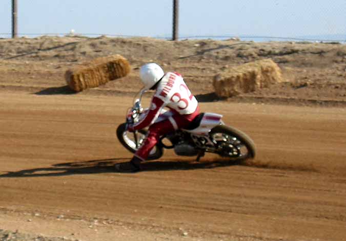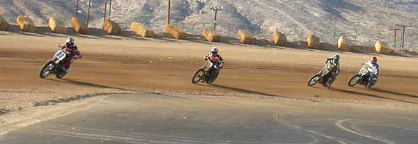 Go fast, turn left, go fast, and turn left! That’s all any one of the 84 entrants had to do, to emerge victorious on the banked dirt oval at Willow Springs. For this particular AHRMA National Larry Wilburn brought in eight truck loads of D.G! He further more spared no expense in time or money so as to provide the best possible racing surface, it was. Mother nature provided plenty of sunshine, although the wind did kick up in the afternoon, calling for more frequent appearances from the water truck. Dennis Suter (The Promoter) buried his head into his computer like a mad scientist, and produced flawless heat, main, and stat sheets. All the while Chris and Jeff Apple handled the starting and staging respectively. Of course Larry Wilburn hadn’t left or hardly slept in 48 hours, and was always at hand to maintain the track! At 10:30am with the AHRMA Road Race National just to the west (on the big track) the first flat track practice session got underway! At high noon the first of 19 heat races began the day’s battle. After advancing through their respective heat races and a lunch break some 17 main events were posted.