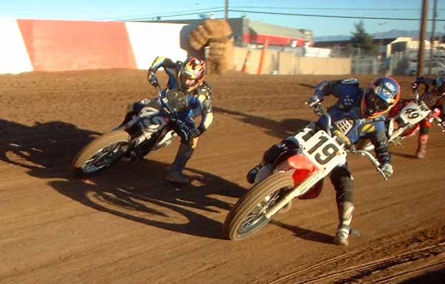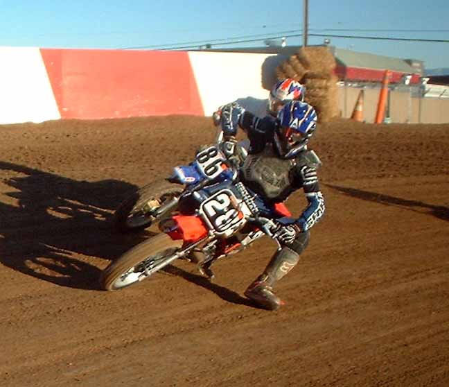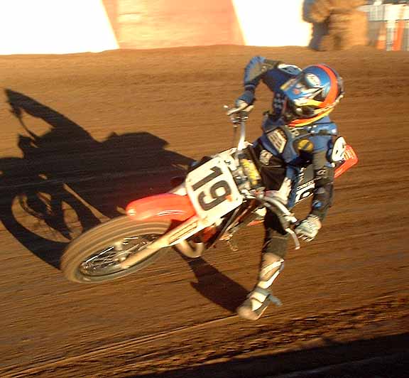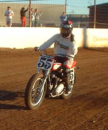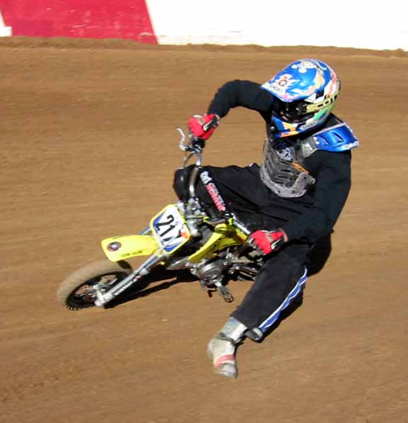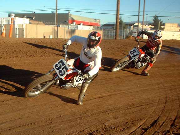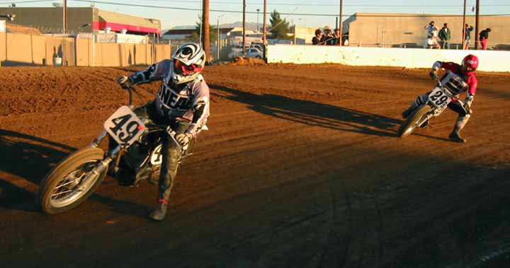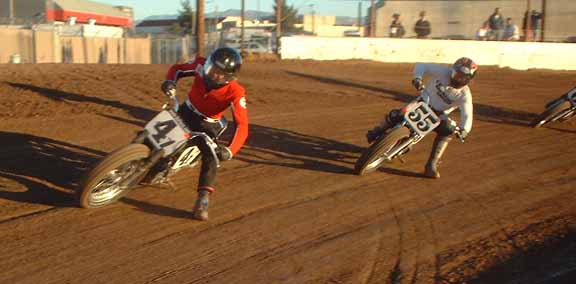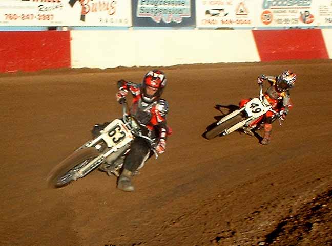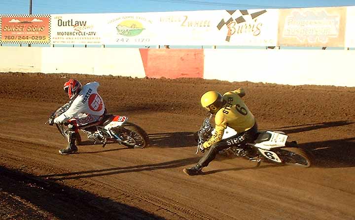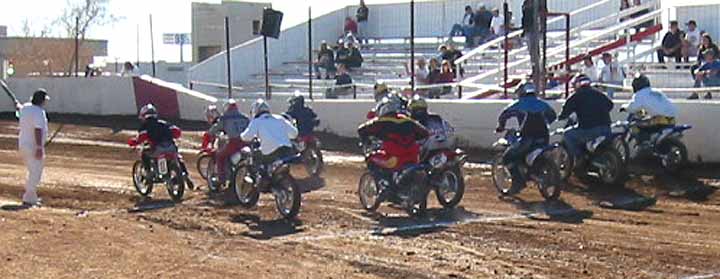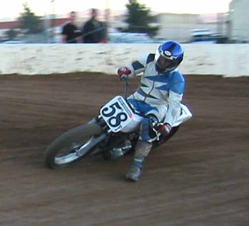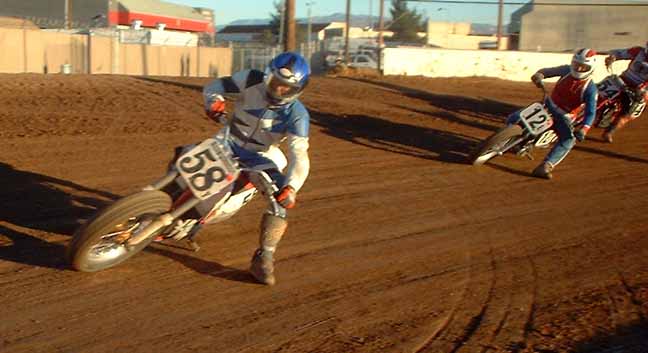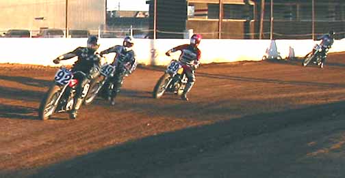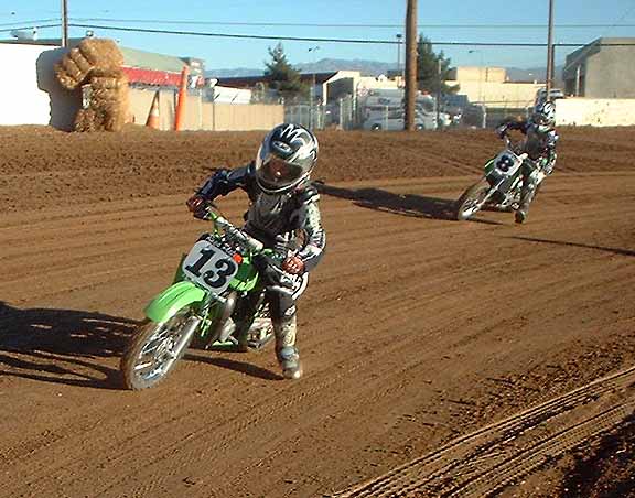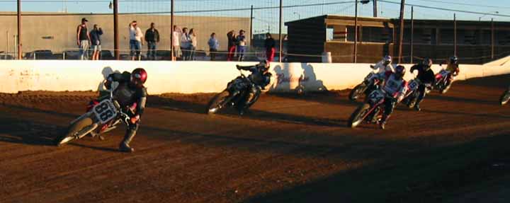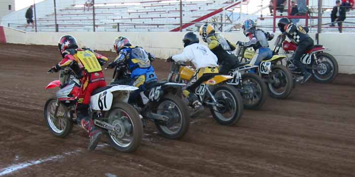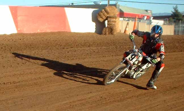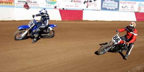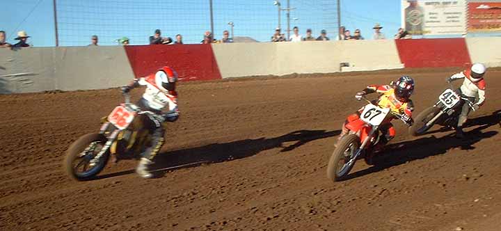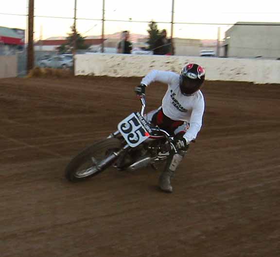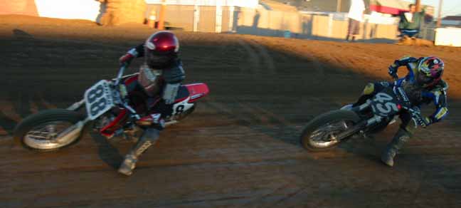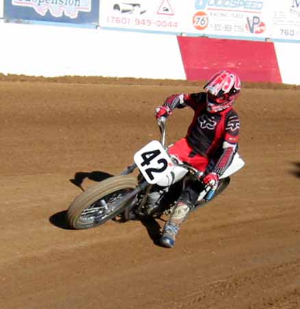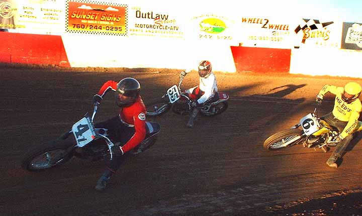 With Flat Tracks becoming an endangered species in Southern California these days, due in part to astronomical insurance cost and the rising land value, it is with great pleasure I report that the banked, cushioned, 1/8 mile oval at San Bernardino County Fairgrounds in Victorville, CA., is one great race trace! Proprietor John Eden knows how to groom a track, as any one of the 126 entrants would attest to. Unusually warm weather, with a 77o temperature reached by the 12:00noon rider's meeting/trophy presentation made this a perfect race day. What followed were three twenty minute timed practice sessions, with heat races immediately afterward.