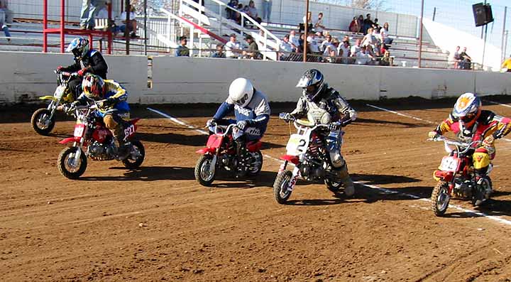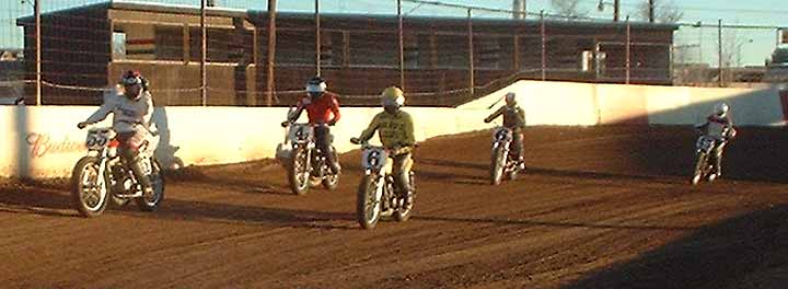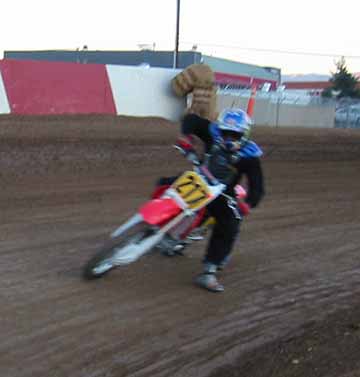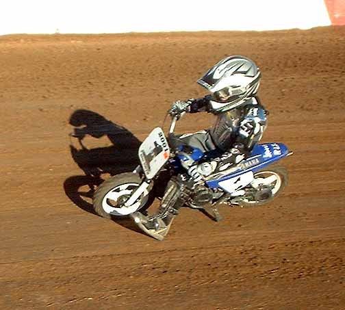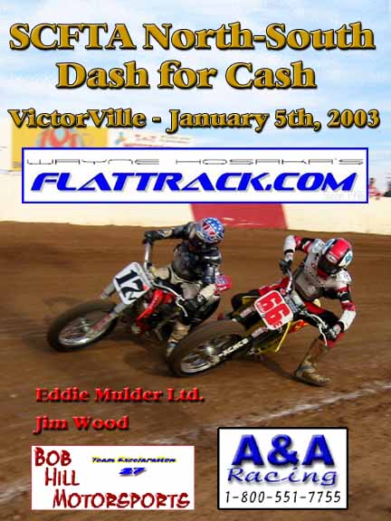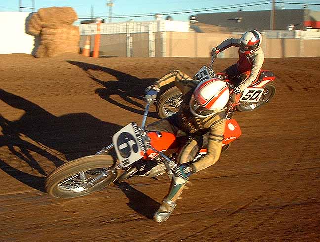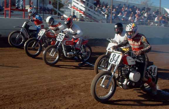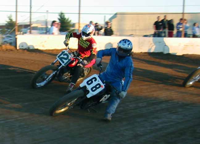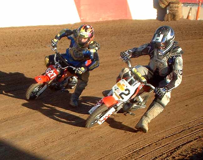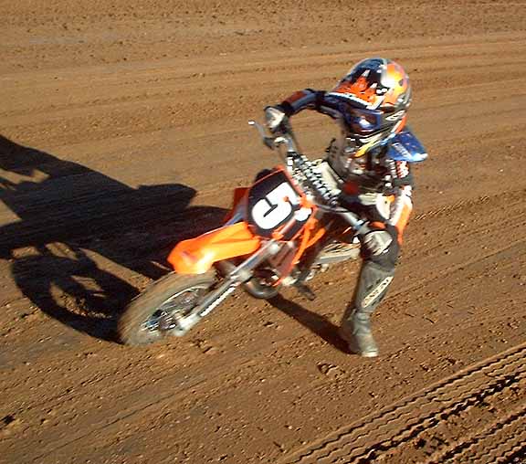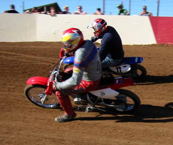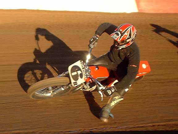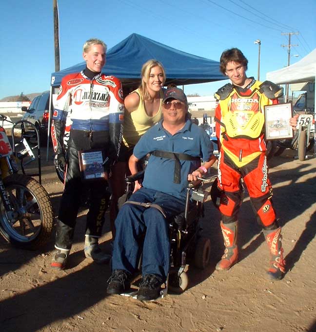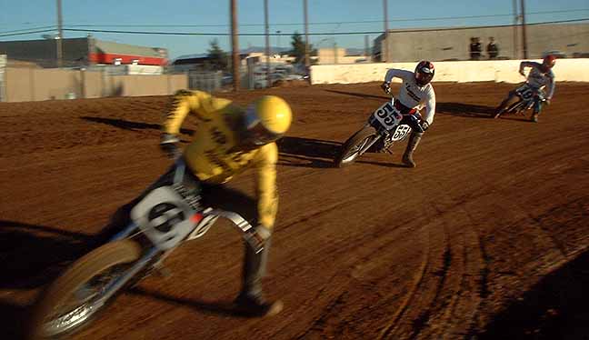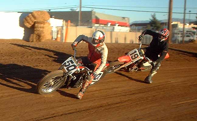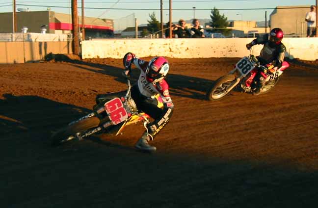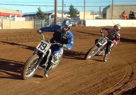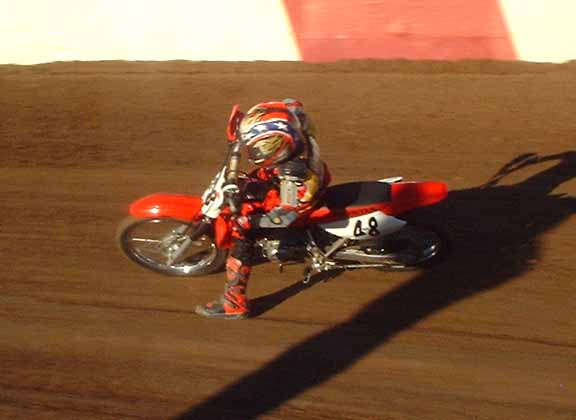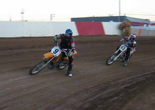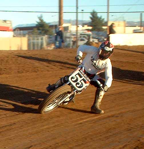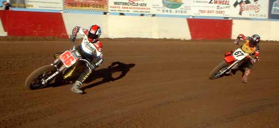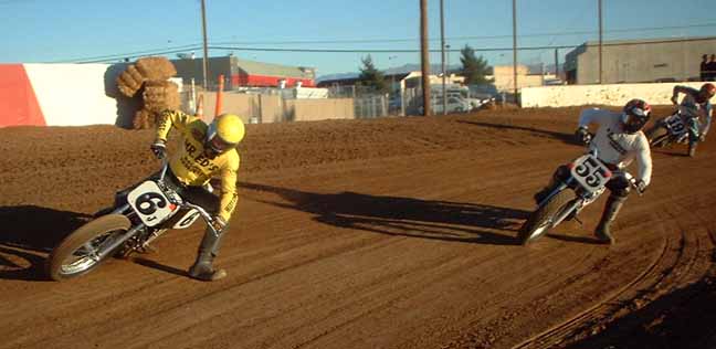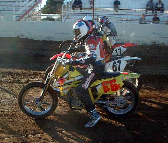 With Flat Tracks becoming an endangered species in Southern California these days, due in part to astronomical insurance cost and the rising land value, it is with great pleasure I report that the banked, cushioned, 1/8 mile oval at San Bernardino County Fairgrounds in Victorville, CA., is one great race trace! Proprietor John Eden knows how to groom a track, as any one of the 126 entrants would attest to. Unusually warm weather, with a 77o temperature reached by the 12:00noon rider's meeting/trophy presentation made this a perfect race day. What followed were three twenty minute timed practice sessions, with heat races immediately afterward.