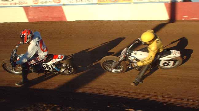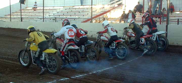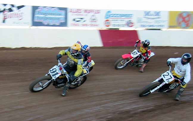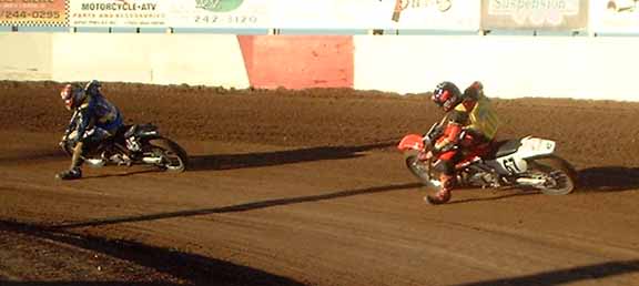 The Pro class had one of only two riders to ever turn lap times under 12 seconds sitting on pole, Jimmy Wood turning 11.6/10 seconds had the fastest time of the day. Maxima's Wood on the DRZ Suzuki rocketed into the lead and took off. Jim Rosa (who hadn't crashed anyone all day; except trying to take out this reporter on the infield) ran second, with Ron Wood's Elliott Iverson third, and Richard "Mule" Pollack in fourth. Ian Foulds getting a drive on his Yamaha 250 shot into third on lap two and was all over Rosa like a fly on flypaper. Lap three Bob Cobb hit the dirt, ending his day, but was up and ok! Back at the front Maxxis Tire's Jimmy Wood disappeared, leaving the only real battle on the track for second. Rosa and Foulds went at it lap after lap. Foulds who's riding, better every time we see him just couldn't get around Rosa's 450 Honda. At the checkered Wood prevailed by 5.6/10 seconds over Rosa and Foulds. Jimmy Wood thus picking up the lions share of the donated monies on the day from Bob Hill Motorsports, Southland Racing, the Flattrack Page, and Uncle Eddie Mulder.