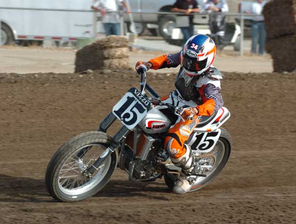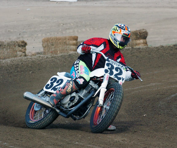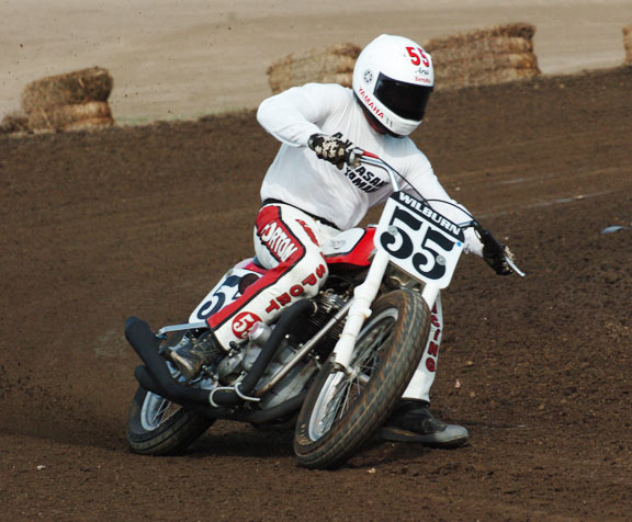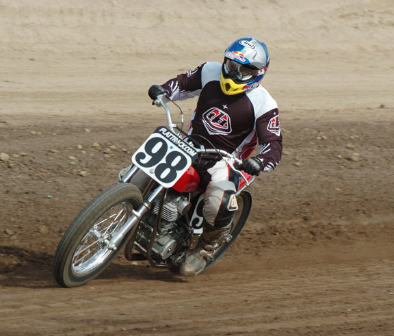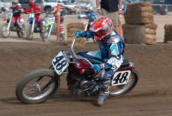 The Brown's Cycles/ARD Ignitions Classic 500 and Dino class were combined with ten riders competing. Chris Rudy on his potent H-D KR750cc took point from pole position with Lenny Rodriguez second and Mike Vital trying his hand aboard a 1946 Indian 750cc third, but first for the Dino's. Confused? Remember there are two classes running. Vital make quick work of Rodriguez for second on the track with Ross Stuckert moving forward to the fourth place spot. At the front Rudy posted a 19.89/100 second lap time that no one could match as he pulled away. On lap three Stuckert made a move and took third away from Rodriguez, who now had Joe Pape and Bill Kolkman closing on him as well, making it a three way battle for fourth with two laps remaining. At the finish Rudy long gone won the classic 500, with Vital second on the track but first in the Dino group. Stuckert and Rodriguez were second and third for the 500's, with Kolkman second to Vital in the Dino.