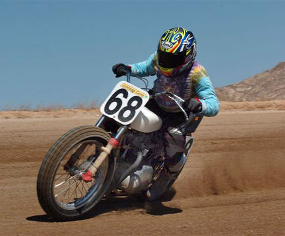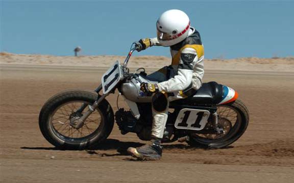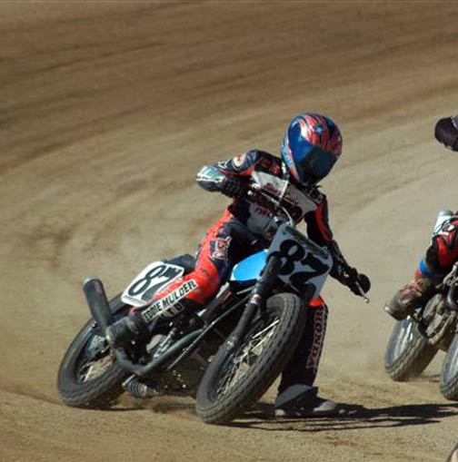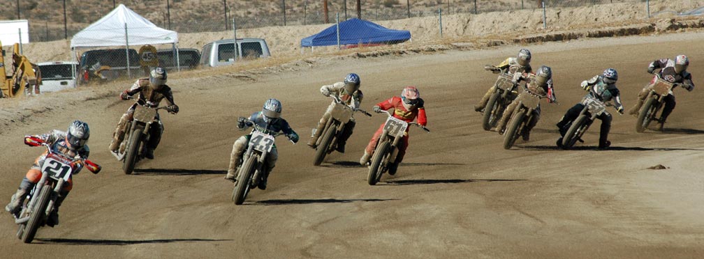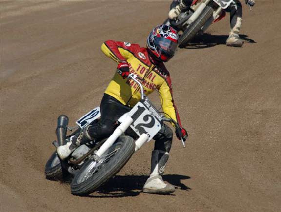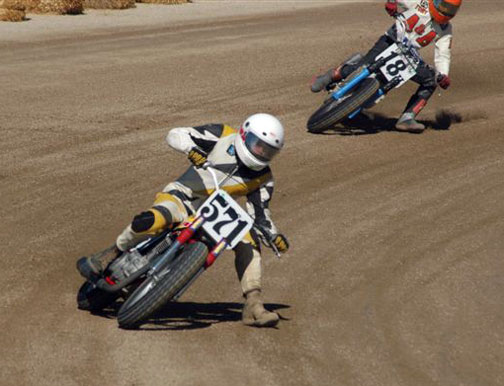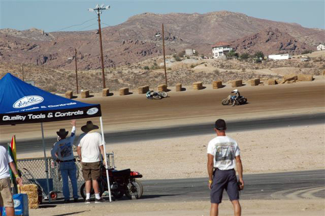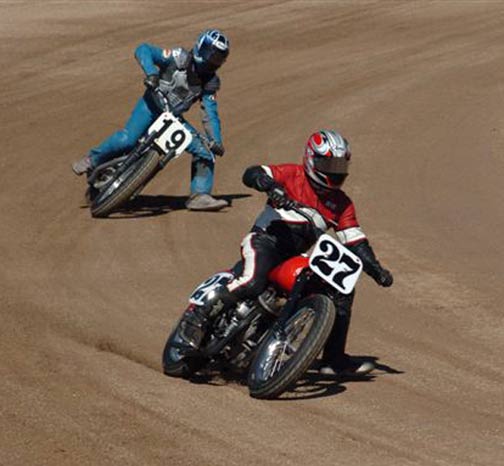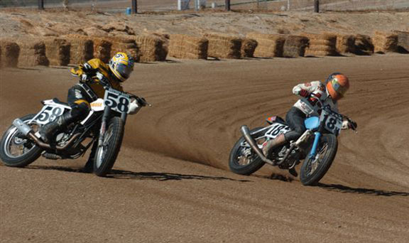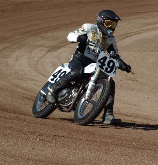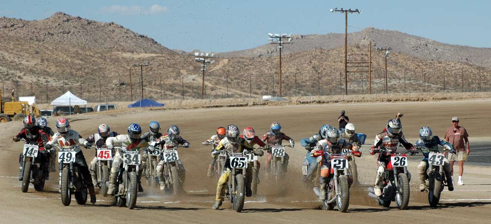 | Eddie Mulder's West Coast Vintage Dirt Track Series Round #5 Walt James Stadium Willow Springs Raceway – Rosmond, Calif. 9-27-2008 Article by Jamey Blunt / Photos by Janice & Jessyca Blunt Returning to Walt James Stadium within the Willow Springs Racing complex for round five of Eddie Mulder's W.C.V.D.T. series were seventeen heats, and fourteen main events. Temperatures reached the ninety's but the on track action was even hotter on the 3/8 mile banked oval prepared to perfection. Jeff Lessley riding a 1974 Bultaco led off the line in the MAXXIS Tires/Brown's Cycles Senior main event. H.D. mounted Joe Suebert gave chase and used his superior horse power to motor past for the lead by turn three. Gary White also on a H.D. settled in at third with Steve Craft fourth and Merritt Moore fifth. On the exit from turn two for the second time Lessley slid underneath Suebert to recapture the lead. By the completion of two laps Moore had moved up to fourth while Ron Lessley was mounting an attack from a terrible start. Lap three Jeff Lessley put in a 24.08/100 second lap in his attempt to gap Suebert, who now had White closing in on him. With a lap remaining Ron Lessley pushed past Moore and Craft both to finish in fourth. This dropping Craft to fifth and Moore back to sixth as Jeff Lessley won over Suebert. Hard to imagine but it's been thirty years or more since Steve Nichols raced at the famous Perris Scrambles track in Perris Calif. Nichols making the trip west from Oklahoma, when off from his duties as the go to guy for tires in Motocross and Super-Cross staged with twelve other riders over the age of thirty five for the Motion Pro/A&A Racing "Vet" main event. Joe Steffen read starter Fred Allen like a Dr. Seuss book to lead into turn one, be it ever so briefly as Nichols blasted past into turn two to lead down the back straight. Mike O'Neil ran in third as Steffen ran wide into turn three leaving a double wide door open for O'Neil to move up to second, but the cost was much higher than one position as Larry Earhart and Mike Besemer dropped Steffen two more spots as well. At the front Nichols had put his head down and put in the fastest lap of the race at 22.24/100 seconds as he distanced himself from O'Neil. Unnoticed all the while was Joel Kath as he slipped under the radar from a ninth place starting position to run in fourth by lap four. With a lap remaining Nichols had a full straight lead over O'Neil and Kath was now up to third where he would finish. Earhart would hold on to fourth over Besemer who just couldn't seem to get his normal rhythm going and Steffen would finish in sixth. The Barnett/Bartels H.D. Super Senior final brought Mickey Alzola out of hiding, but Joe Brown accustomed to winning did what he has done most of the year, launch a perfect start to lead the field into turn one. Alzola followed in second with Herb Wolff third, Merritt Moore fourth, and Dave Cheney fifth. Entering turn three for the second time Alzola decided he was ready to take the lead but Brown didn't want to give it up that easily and fought back while Wolff and Moore were exchanging paint as well. Brown ran high into turn three again leaving the door open for Alzola, but Alzola was still waiting to pounce. Moor meanwhile found his way past Wolff and once by was pulling away. At the white flag Brown led but Alzola was studying and waiting for just the right moment to strike. Entering turn three Alzola and Brown were side by side, as Brown moved over to take Alzola's line away Alzola expected it and crossed under and won the drag race to the stripe my inches for the victory. Brown was a close second with Moore a distant third, Wolff a solid fourth and Cheney closing in fifth. Former National number 11 Jim McMurren brought out one of his factory H.D. Sprints for Mike O'Neil to ride in the K&N Filters/Maxima Racing Oils Classic 500 class. O'Neil didn't disappoint in spite of having an over thirty year old Pirelli tire on the front and a fifteen race old Maxxis on the back he led into turn one over the BSA Gold Star of Joel Kath and the Triumph of Jeff Lessley. Brad Holt gave chase on another H.D. Sprint in fourth with Ross Stuckert BSA mounted in fifth ahead of the H.D. of Jack Alexander. With two laps in the books O'Neil had an eight bike length gap over Kath turning a 23.65/100 second lap time no one on the track could match. Back in fifth Stuckert had Alexander pulling alongside at every opportunity, only to have Stuckert race mistake free not giving him a way past. When the checkered flag came out O'Neil won by a full straight away over Kath, with Lessley forgotten in third and Holt just as lonely in fourth. Stuckert never succumbed to Alexander's pressure and finished fifth. One thing Joe Suebert can do is start, rarely is he beaten into the first corner, and the AGV Helmets/Tuffplates Modern 750 final was no exception. Suebert led only to have Paul Herman push his Triumph past before the exit of turn two looking possessed. Gary White sat in third ahead of Mark Stuckert, Merritt Moore and Dave Cheney. Once out front Herman was gone posting a 23.09/100 second lap time to Suebert's best of 24.12/100 seconds. From the second lap on it was a follow the leader precession. In the end it was as it started, Herman, Suebert, White, Stuckert, Moore and Cheney. The Rod Lake Racing/Berkeley Honda Yamaha SeaDoo Modern 500 class had three riders very close in points for the championship. Mike O'Neil launched off the line to lead into turn one, Mike Gonzales ran second with Jeff Gonzales third. By lap two O'Neil showed he was serious as he posted a 22.54/100 second lap time and was pulling away at the front. No one in this field was capable of running under the 22 second mark on this day as O'Neil stretched out his lead. Mike Gonzales likewise pulled away from Jeff Gonzales while Gary Ritchie, Robert Bush, and Paul Lane watched helplessly from afar. O'Neil would go on to the victory setting up a tie in points for 