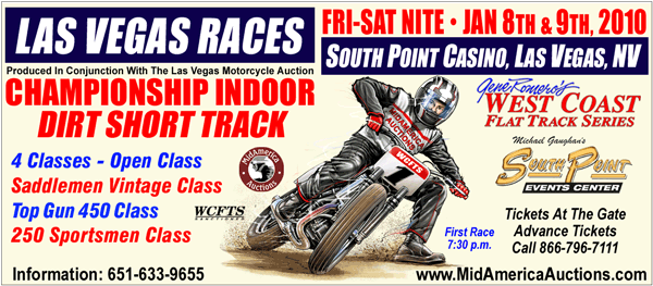 ![]() ![]() SOUTH POINT CASINO – LAS VEGAS, NEVADA Indoor Short Track – Round #1 January 8th and 9th, 2010 Gene Romero's West Coast Flat Track Series     Friday Open Class            Saturday Open