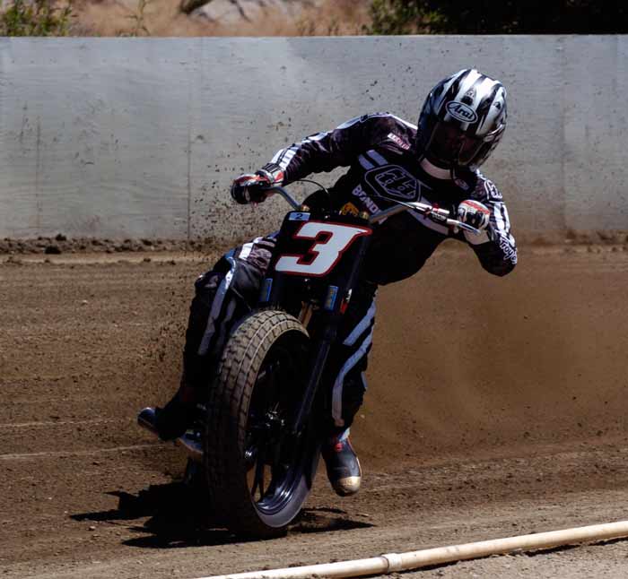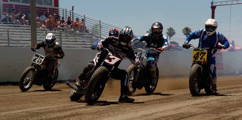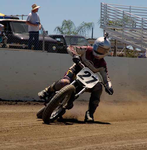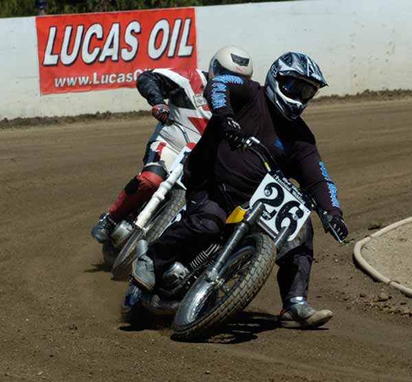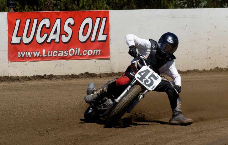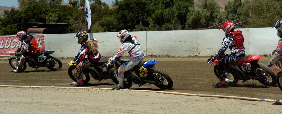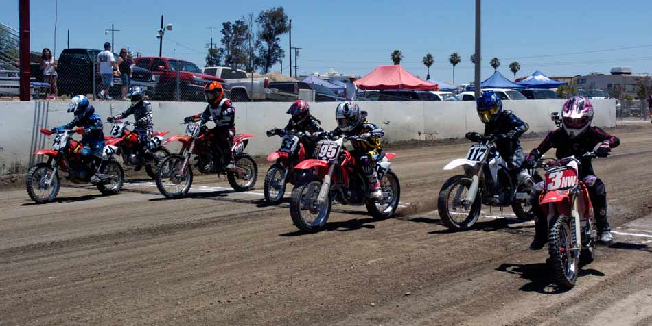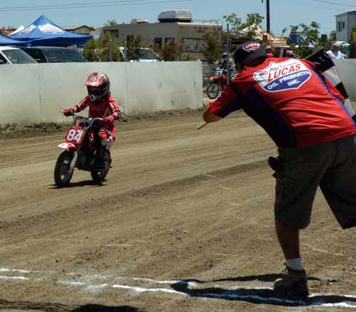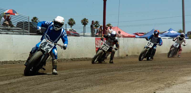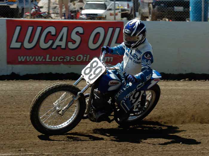 Perris Raceway – Perris Ca. July 10th, 2011 Article by Jamey Blunt Photos by Janice Blunt With temperatures expected upwards of the one hundred degree mark some racers opted not to attend Sundays round seven of the S.C.F.T.A. But for the eighty-five that did they were treated to great racing on a well prepared track. Sixteen heats and fifteen main events made up the day's program from Youth 50cc to Premier Senior +70 classes. Lucas Oil presented a wide verity of their products with a display in the pits of some of the awards the class winners have come to expect. Hats off to Lucas Oil! After the mandatory riders meeting and practice it was time to go racing. ![]() Sticking with the tradition of having the Youth classes start the program, the Youth 65cc field was staged first. Alyssa Flores, Frank Flores, Noah Bush, and Braydon Jolly all have to be asking themselves what it will take to beat Clayton Williams. Williams is the force to be reckoned with and went wire to wire for the win. In the Youth 50cc class Mishaps were the order of the day, but when the dust settled (the track was watered every two to three races) Toby D'Avignon picked up his first main event victory in memory. Drake Bondino was right there in second for his best finish to date as well. ![]() Allison Stacey was away first in the Youth 85cc class Sean Heeney left the line third but quickly shot into second and went after Stacey. At the stripe for the completion of the first lap Heeney took the lead. Lap two Heeney posted the fastest lap of the race at 15.96 seconds while Stacey's pace was slowing with Clayton Williams closing in, just after the white flag going through turn two Stacey threw it all away giving Williams second and advancing Monica Gil to third. ![]() ![]() Jeff Lessley had the fastest reaction time off the line in the Vintage 2-Stroke 250-360 Expert class. However just before turn one John Kocinski shot to the lead, made himself real wide and stretched his throttle cable. Kocinski having attained his goal of setting the overall track record on the Perris ¼ mile oval on the second lap of his heat race at 14.28 seconds wanted more and was looking to break the fourteen second barrier. But on this day the track wasn't as good in the main as it was in the heat race and Kocinski had to settle for the main event victory and the track record. Still a major accomplishment on a 250cc thirty-five year old motorcycle, Lessley, Nick Armstrong, Ryan Gifford and Jim Wood would follow Kocinski home in that order. It has been rumored that Kocinski is an alien but as yet there has been no DNA test to prove it. ![]() The Classic Vintage class (also known as the "Brakeless Class") had a small field on this Sunday due in a large part to the fact the older air cooled machines don't fare too well in extreme heat. But when it was all said and done Jeff Apple's 16.52 second lap time was the fastest of the field and he notched another victory in his trophy case over Lenny Rodriguez, James Kohls, and Joe Pape. ![]() Keith Bradford led the Bomber main event into turn one off the line but was on the outside which allowed pole sitter Danny Perkins to take over at the front on the exit from turn two. Bradford has been absent from the racing scene for a few years and in the past was a force to be dealt with and seems to be re-gaining his old form with each passing round. Jim Lundgren ran in third with David McNeeley fourth, Larry Earhart fifth, and John Lundgren sixth. Two laps down had Perking pulling away with a nine bike length gap and turning the fastest lap of the race at 15.07 seconds. On the exit from turn four on the fourth lap Lundgren put a wheel under Bradford and moved him out wide to take away second place. A lap later McNeeley was up to third as Bradford appeared to be getting tired and was slowing. McNeeley at this point had picked his pace up and was closing on Lundgren but it was too late as Perkins took the checkered flag with a two second gap over Jim Lundgren with McNeeley a bike length back in third , Bradford glad to see the race over in fourth and Earhart in fifth. Bill Kolkman (yes Kayl's dad) made a rare appearance and raced the Senior Novice +50 class, which he won. Kolkman's fastest lap of 16.17 seconds was good enough to top Corey Bauman, Mark Prentice, Dennis Ackland, Larkin Wight, and Shane Van Sickle. ![]() In the Senior Vet +50 main event Vince Graves from the middle of the front row was the first rider to reach turn one. On the exit from turn two Graves went wide and left the door open for Jim Wood to take over the lead. Next entering turn three Graves again went in high and wide and Ryan Gifford went past for second position. Back to turn one for the second time and Jeff Lessley ran it up underneath Graves for the third spot while Wood at the front put in a 15.62 second lap. Larry Earhart and Jim Ottele ran in fifth and sixth after a less than ideal start from each of them. On the next go round Lessley who was working the inside line put a wheel under Gifford and took over second place through turns three and four. Ottele was by this point up into fifth and making a run at Graves. Two laps remaining saw Ottele show Graves a wheel entering turn one and make the pass into fourth. On the last lap Ottele made a run down the back straight and squared up turns three and four to get a drive and beat Gifford to the stripe for third position behind Wood and Lessley. ![]() Rick Bell pushed his new Bultaco off the track before the race ever started in the Vintage 2-stroke 250-360 Novice class while Gary Lane form Lucas Oil led the field into turn one. Steele Friedrich slotted in at second with Michael Fritz running third. Exiting turn two for the second time Shane Van Sickle made the pass on Fritz dropping him a spot. At the front Gary Lane turned a 17.04 second lap as he was the overall leader and first 360cc machine in the field. Rick Logan who ran fourth on the track but second 360cc completed the order as it