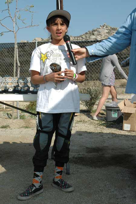![]() Alyssa Flores was on happy camper. She rode her heart out all season and it payed off. Alyssa won the champion- ship in the Youth 65cc class over her brother Frank and finished fifth in the Youth 85cc class as well.  |