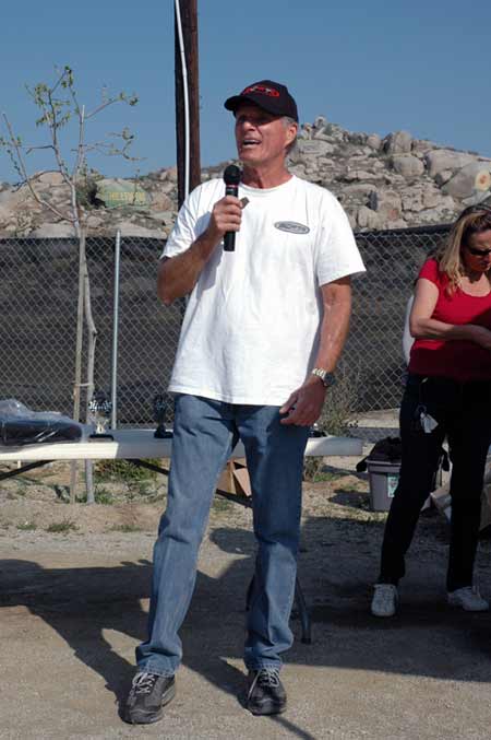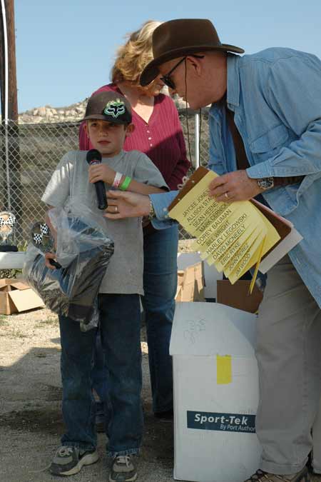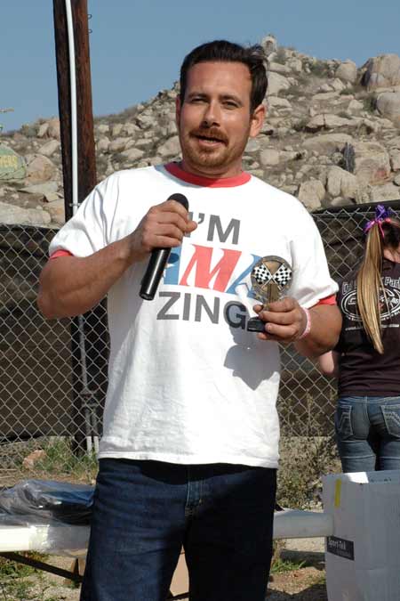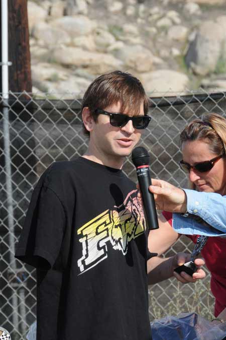 ![]() Donna Edwards (the driving force at Perris) Presented track announcer Jamey Blunt with a championship jacket. Jamey announced his first ever motorcycle race at Perris for Grace & Gerry Burton way back in 1970 at the old scrambles track.  |