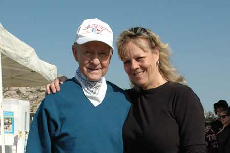 ![]() Dick Mann posed with anyone who wanted a photo. Here Colleen Douglas (turn three & four corner worker) gets her photo with Mann.  |