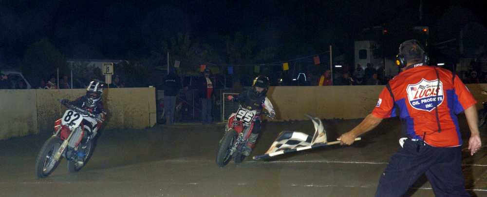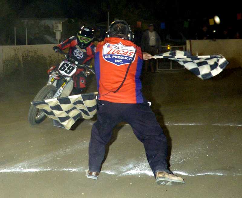 Here Jimmy Wood get's the checkered flags from starter Rudy Gil. It was a wire to wire race for Wood.