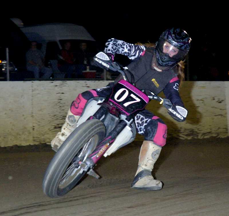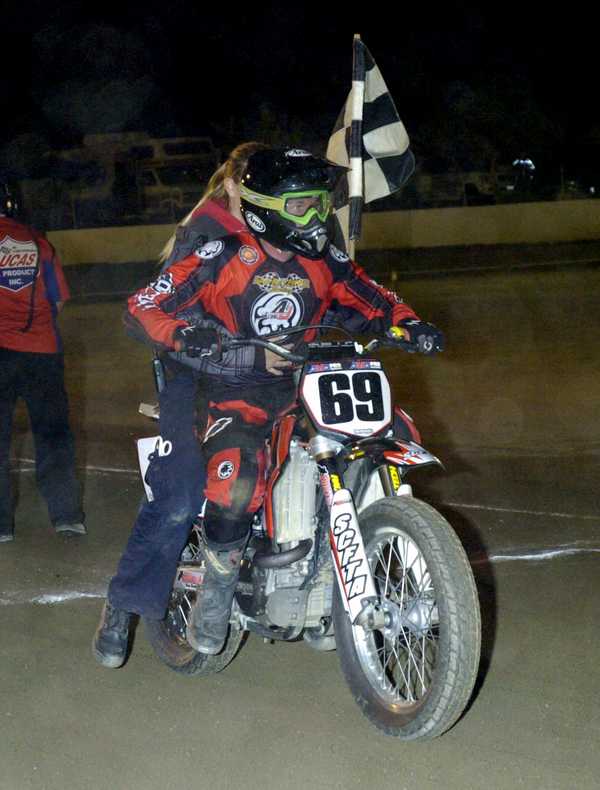 After winning the twenty lap pro main event Jimmy Wood gives girlfriend Ashleigh a ride on his victory lap.