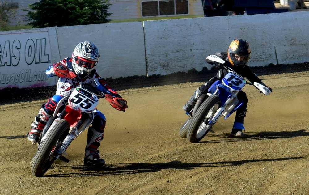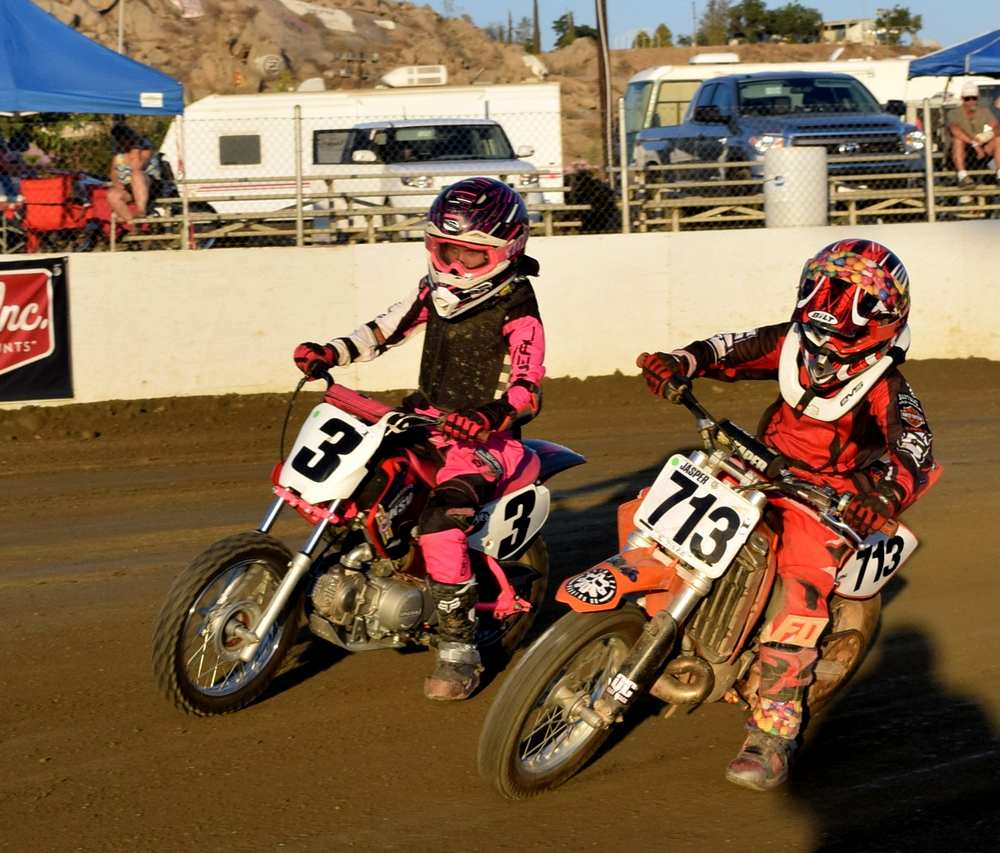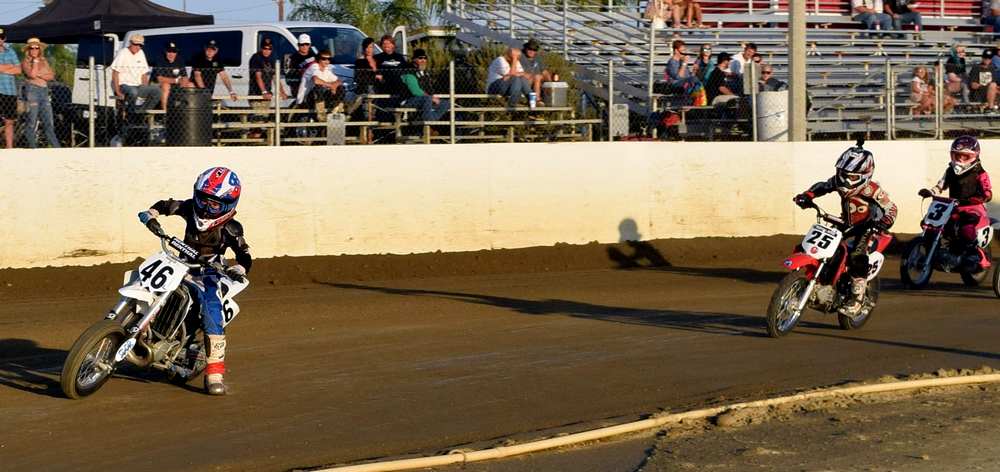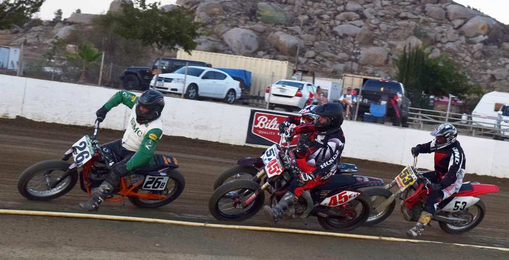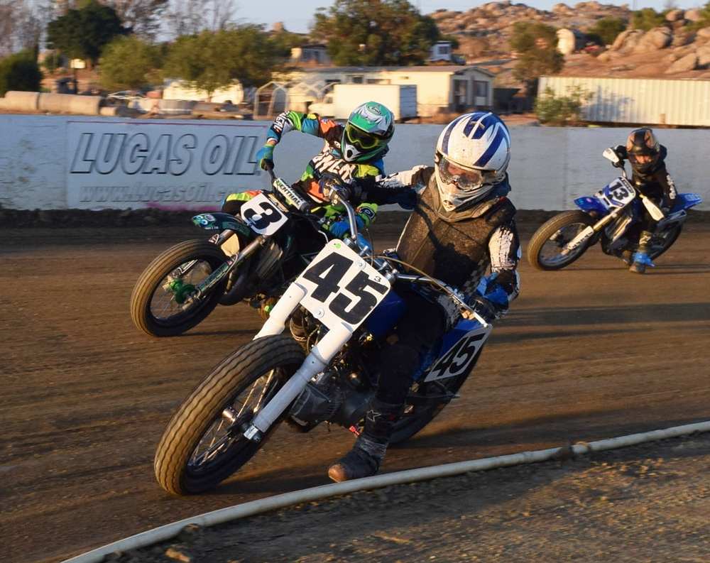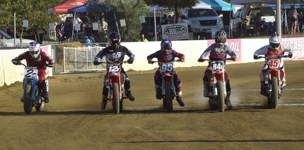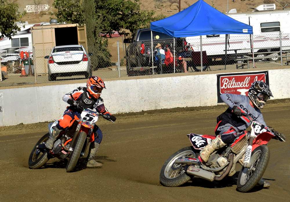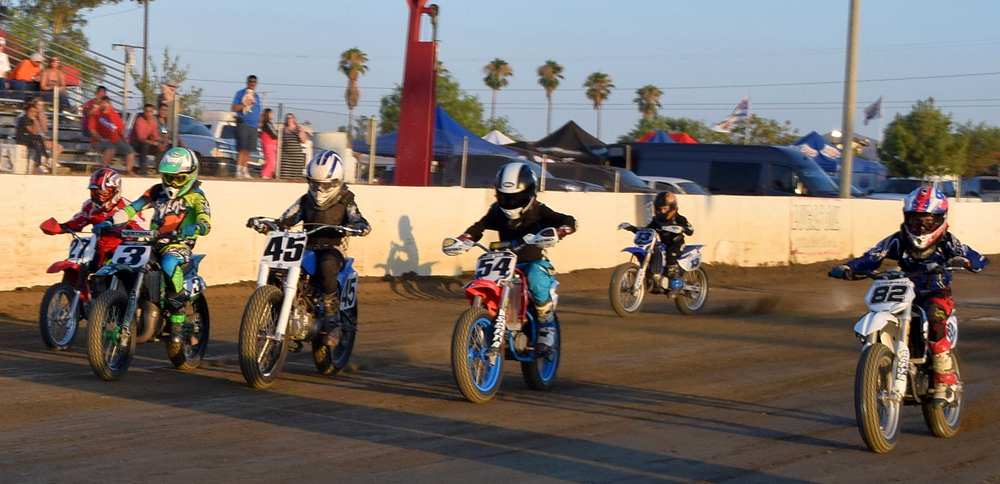 August 5, 2016, Perris California, Perris Raceway,Southern California Flat Track Association'sChampionship Series, Round 8Photos and text by Rodney RutherfordSouthern California Flat Track Association's "douze séries de Championnat", is now on towards round nine after a summery Southern California Saturday round eight, and with four rounds remaining on the roster, still plenty of racing left. Round nine will be held on September tenth as we enter into the Fall portion of Southern California's premiere sliding series. Before we get on with racing coverage, we will cover some of the people that make SCFTA tick, as well as the racers of tomorrow, and that wonderful 96 decibel sound level that will be required for 2017. Elliott Iverson (left) and Rudy Gil (right), exemplify the focus, professionalism, fairness, and solidarity of the finely tuned SCFTA track officials, because there is no "I" in team. The two are seen here collaborating and ensuring the races are ran as safely, fair, smooth, and punctual as possible. Emde Performance racer Danny Perkins, was sidelined the majority of this season with an elbow injury, but was ready to race at round seven. Unfortunately his bike was not, after failing the current SCFTA maximum of 100 decibels and he was unable to keep the bike running after making some adjustments. Returning for round eight after installing a 38 millimeter carburetor on his Cycle Logic 1978 Yamaha TT500, Perkins was fast as ever which we will delve into later in the article and tested at 95.7 decibels. As a reminder, SCFTA is currently allowing a grace period for sound testing, all bikes must be 100 decibels with the optimum being 96 decibels or lower, but for 2017 there will be a limit of 96 decibels that everyone must meet in order to keep the track open and neighbors happy. Alarmco racer Travis "Corner Speed" Horn, continues to proceed up the racing food chain with his winning ways, aided by his support structure and relentlessly dedicated parents Jeremy and Gina. With their unlimited love and encouragement, the third grader conquers multiple disciplines on a routine basis including Speedway, Flat Track, Supermoto, and Road Racing. The Team Motorsports Junkie slider is decorated in several racing series, winning the 2015 Gumball Pee Wee (PW) Modified (Mod), then returning in 2016 for a double dip repeating for his second consecutive Gumball PW Mod Championship, and hoisting the number one plate in the Gumball 2016 PW Stock title as well. He also holds class titles in the IV League Flat Track series, and has four SCFTA number one plates from 2014 to 2015. In the 2016 Speedway series he has over five and Division 2 main wins in the Mini 150 class. Horn recently finished third in the 2016 FIM/AMA Silver Cup Mini 150 Division 2 and has since moved up to Division 1, reportedly finishing the season with multiple Division 1 top three finishes . With the SCFTA he currently stands first in the SCFTA 65cc Open, with an undefeated mark in all seven rounds he has raced. Horn would like to thank K & N Filters, Pit Strap, De Mario Racing, Pistonbones, Gina Horn Designs and all his supporters. The Mitchell Family, are one of several Families that support and a pillar of the racing experience that is the SCFTA. Jake Mitchell found himself getting into racing with encouragement from his sister, Isabella "Izzy" Mitchell. Racing for three years and winning a 2014 SCFTA title, he is hungry for more. Related to long time Flat Track racer, Danny Perkins, he has an encyclopedia of knowledge at this door step when needed. Looking forward to moving up to the 250 Youth Open, he is currently racing in the Youth 85cc Open, and leads the points in the 85cc 2-Stroke Beginner on his Kawasaki KX85. He would like to thank his Aunt Kathie, Aunt Carrie, Christian, Garrett, Danny Perkins, Mom and Dad, Leatt, C2O Coconut Water, Ryno Power, O'Neal, Dragon Alliance and everyone that supports him.. Frank Flores, part of SCFTA's illustrious Flores Family, with mom Patty and Dad Jess manning the helm of the Family team, consisting of Frank and Sister Alyssa. Frank will be moving on soon to the 250 Youth Open, after being a foundation of the SCFTA 85cc program. He would like to thank Ron's Rear Ends, Flores Automotive and his entire Family. Let's race. Colin Petton (46), has an itty-bitty lead over Horn in their 65-70cc Open main melee. No problem for the scrapper Horn sporting the duece-cinco, as he gives the throttle cable a serious tension test ripping by Petton in the early going and the main win is his, Petton for second. Petton went on to win in the 65-70cc 2-Stroke Amateur. Horn also racing in the class against Petton, tested the waters in his first ever ride with slitted Flat Track tires on a Kawasaki KX65, completing his inaugural race on the set up in second. Sierra Hickerson (3) and Jasper Heathfield (713), getting into a sliding scrap as they do almost every time they race together. This time it was Heathfield with the best spot at the end taking third, and Hickerson fourth. Always the jester, Isabella "Izzy" Mitchell, brings home the fifth spot in the 65-70cc Open. The 85cc Open main restart and let's get it on, seen here are Jadon Schroeder (27), Jake Mitchell (3), Conner Hickerson (45), Tanner Richey (13), and Travis Petton IV (82) at the pole position. The 85cc Open main is off the line and Tanner Richey gets the fresh air with Zaden Florez in tow, but no sooner we get up to speed the red light is out and a restart in on the menu, reportedly Richey took off too early. Early on after the restart Florez at the front, Petton IV in second, Frank Flores several bike lengths back in third and Conner Hickerson fourth. Zaden Florez (55) and Tanner Richey (13), grapple out of turn two into the back-stretch of the 85 Open heat race. Petton IV slithers inside of turn one and bullies his way into the lead, Florez now second. We go past lap four and Petton jostling away for the win, Florez with a very strong ride