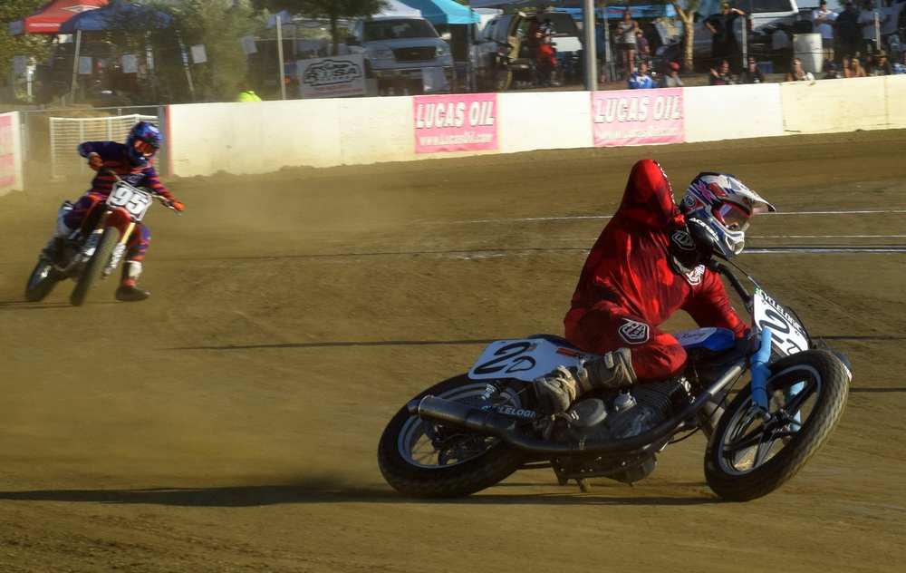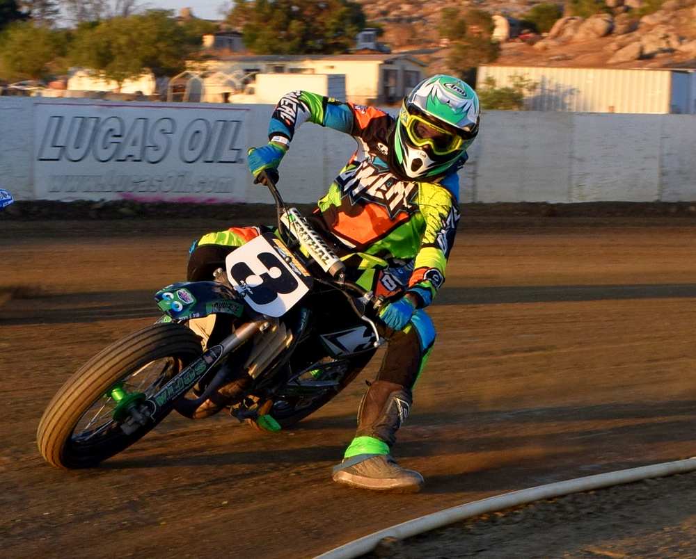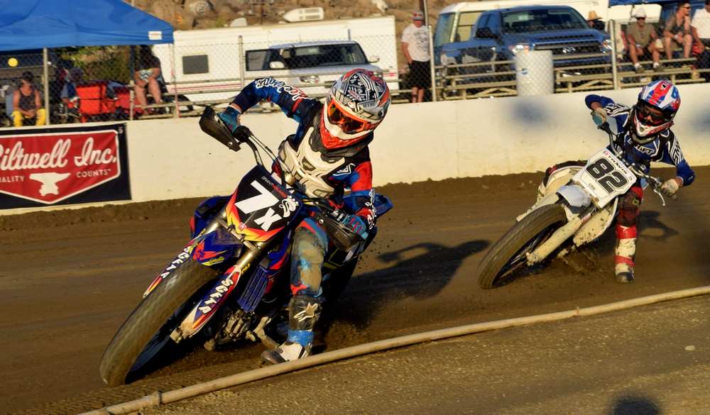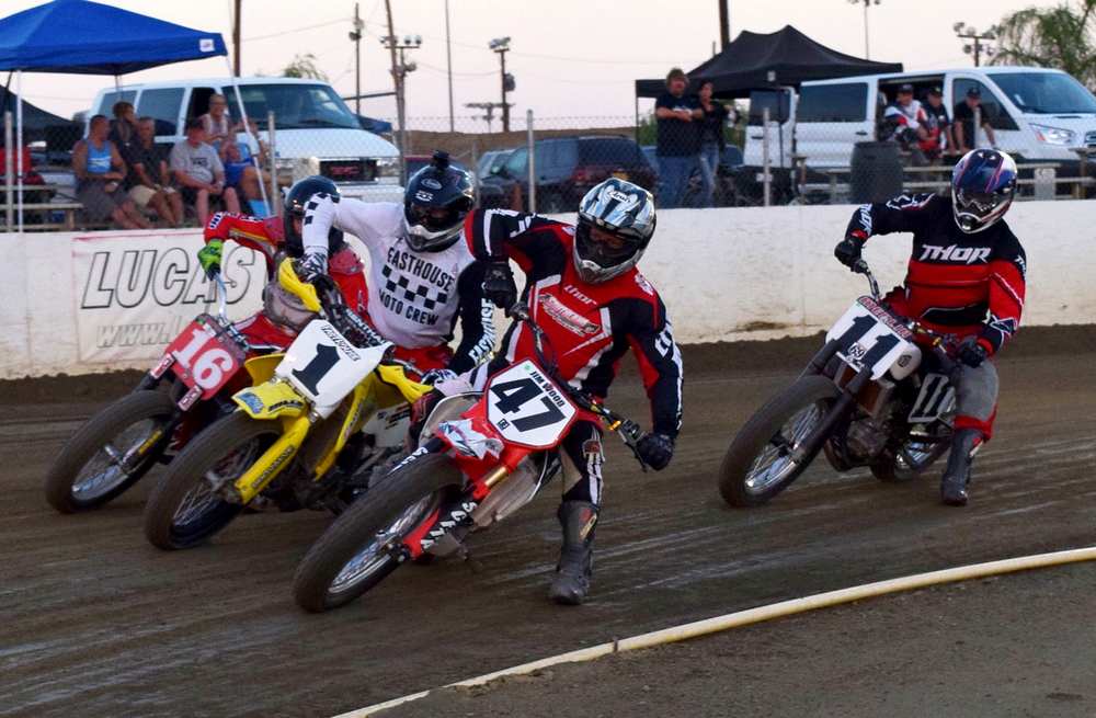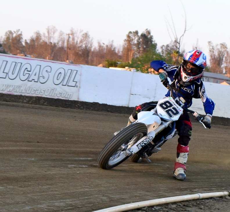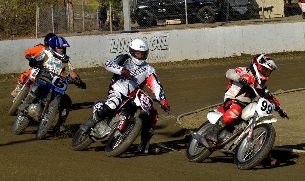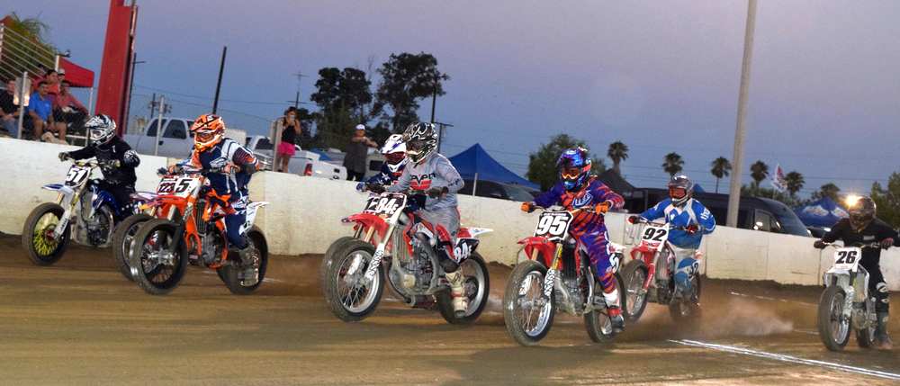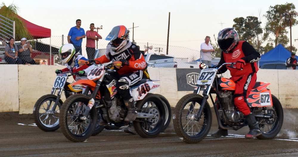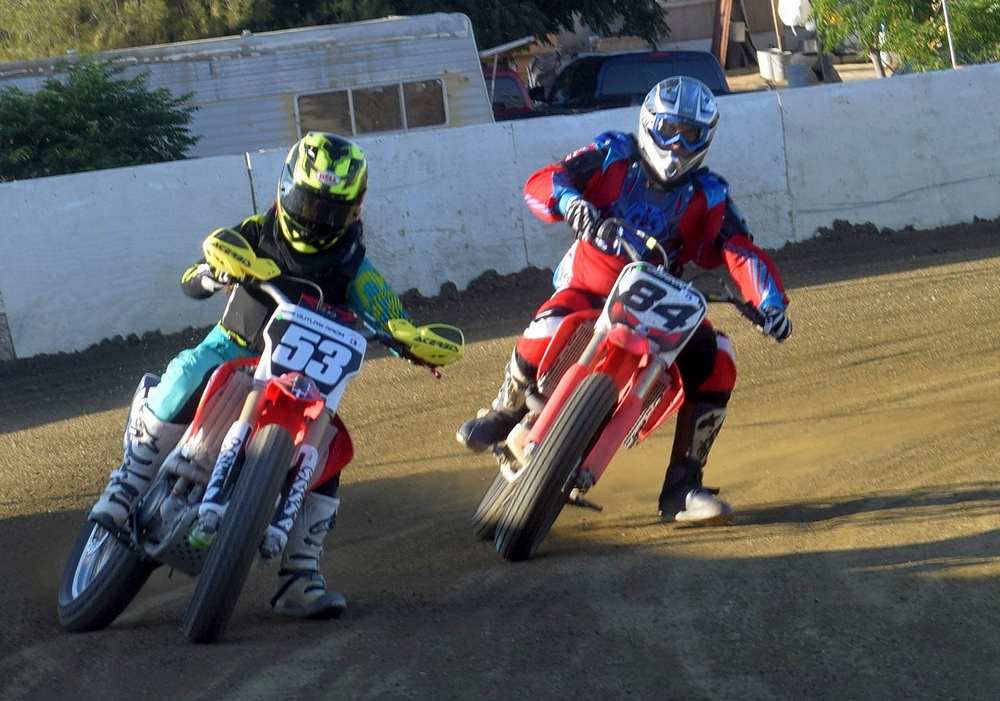 August 5, 2016, Perris California, Perris Raceway,Southern California Flat Track Association'sChampionship Series, Round 8Photos and text by Rodney RutherfordSouthern California Flat Track Association's "douze séries de Championnat", is now on towards round nine after a summery Southern California Saturday round eight, and with four rounds remaining on the roster, still plenty of racing left. Round nine will be held on September tenth as we enter into the Fall portion of Southern California's premiere sliding series. Before we get on with racing coverage, we will cover some of the people that make SCFTA tick, as well as the racers of tomorrow, and that wonderful 96 decibel sound level that will be required for 2017. Elliott Iverson (left) and Rudy Gil (right), exemplify the focus, professionalism, fairness, and solidarity of the finely tuned SCFTA track officials, because there is no "I" in team. The two are seen here collaborating and ensuring the races are ran as safely, fair, smooth, and punctual as possible. Emde Performance racer Danny Perkins, was sidelined the majority of this season with an elbow injury, but was ready to race at round seven. Unfortunately his bike was not, after failing the current SCFTA maximum of 100 decibels and he was unable to keep the bike running after making some adjustments. Returning for round eight after installing a 38 millimeter carburetor on his Cycle Logic 1978 Yamaha TT500, Perkins was fast as ever which we will delve into later in the article and tested at 95.7 decibels. As a reminder, SCFTA is currently allowing a grace period for sound testing, all bikes must be 100 decibels with the optimum being 96 decibels or lower, but for 2017 there will be a limit of 96 decibels that everyone must meet in order to keep the track open and neighbors happy. Alarmco racer Travis "Corner Speed" Horn, continues to proceed up the racing food chain with his winning ways, aided by his support structure and relentlessly dedicated parents Jeremy and Gina. With their unlimited love and encouragement, the third grader conquers multiple disciplines on a routine basis including Speedway, Flat Track, Supermoto, and Road Racing. The Team Motorsports Junkie slider is decorated in several racing series, winning the 2015 Gumball Pee Wee (PW) Modified (Mod), then returning in 2016 for a double dip repeating for his second consecutive Gumball PW Mod Championship, and hoisting the number one plate in the Gumball 2016 PW Stock title as well. He also holds class titles in the IV League Flat Track series, and has four SCFTA number one plates from 2014 to 2015. In the 2016 Speedway series he has over five and Division 2 main wins in the Mini 150 class. Horn recently finished third in the 2016 FIM/AMA Silver Cup Mini 150 Division 2 and has since moved up to Division 1, reportedly finishing the season with multiple Division 1 top three finishes . With the SCFTA he currently stands first in the SCFTA 65cc Open, with an undefeated mark in all seven rounds he has raced. Horn would like to thank K & N Filters, Pit Strap, De Mario Racing, Pistonbones, Gina Horn Designs and all his supporters. The Mitchell Family, are one of several Families that support and a pillar of the racing experience that is the SCFTA. Jake Mitchell found himself getting into racing with encouragement from his sister, Isabella "Izzy" Mitchell. Racing for three years and winning a 2014 SCFTA title, he is hungry for more. Related to long time Flat Track racer, Danny Perkins, he has an encyclopedia of knowledge at this door step when needed. Looking forward to moving up to the 250 Youth Open, he is currently racing in the Youth 85cc Open, and leads the points in the 85cc 2-Stroke Beginner on his Kawasaki KX85. He would like to thank his Aunt Kathie, Aunt Carrie, Christian, Garrett, Danny Perkins, Mom and Dad, Leatt, C2O Coconut Water, Ryno Power, O'Neal, Dragon Alliance and everyone that supports him.. Frank Flores, part of SCFTA's illustrious Flores Family, with mom Patty and Dad Jess manning the helm of the Family team, consisting of Frank and Sister Alyssa. Frank will be moving on soon to the 250 Youth Open, after being a foundation of the SCFTA 85cc program. He would like to thank Ron's Rear Ends, Flores Automotive and his entire Family. Let's race. Colin Petton (46), has an itty-bitty lead over Horn in their 65-70cc Open main melee. No problem for the scrapper Horn sporting the duece-cinco, as he gives the throttle cable a serious tension test ripping by Petton in the early going and the main win is his, Petton for second. Petton went on to win in the 65-70cc 2-Stroke Amateur. Horn also racing in the class against Petton, tested the waters in his first ever ride with slitted Flat Track tires on a Kawasaki KX65, completing his inaugural race on the set up in second. Sierra Hickerson (3) and Jasper Heathfield (713), getting into a sliding scrap as they do almost every time they race together. This time it was Heathfield with the best spot at the end taking third, and Hickerson fourth. Always the jester, Isabella "Izzy" Mitchell, brings home the fifth spot in the 65-70cc Open. The 85cc Open main restart and let's get it on, seen here are Jadon Schroeder (27), Jake Mitchell (3), Conner Hickerson (45), Tanner Richey (13), and Travis Petton IV (82) at the pole position. The 85cc Open main is off the line and Tanner Richey gets the fresh air with Zaden Florez in tow, but no sooner we get up to speed the red light is out and a restart in on the menu, reportedly Richey took off too early. Early on after the restart Florez at the front, Petton IV in second, Frank Flores several bike lengths back in third and Conner Hickerson fourth. Zaden Florez (55) and Tanner Richey (13), grapple out of turn two into the back-stretch of the 85 Open heat race. Petton IV slithers inside of turn one and bullies his way into the lead, Florez now second. We go past lap four and Petton jostling away for the win, Florez with a very strong ride