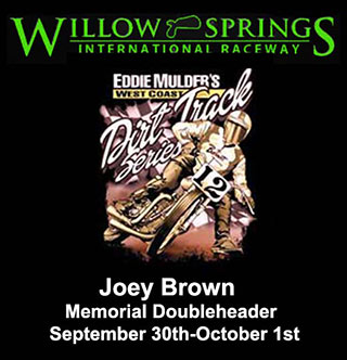 ![]() West Coast Dirt Track SeriesWillow Springs, CaliforniaLink to Willow Springs SportsmanLink to Brown Family RaceOctober 1, 2017 - ProsPro 1st Heat