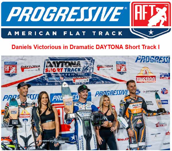 | DAYTONA BEACH, Fla. (March 9, 2023) – Dallas Daniels (No. 32 Estenson Racing Yamaha MT-07 DT) secured a nail-biting victory at the DAYTONA Short Track I presented by Daytona Dodge to open the 2023 Progressive American Flat Track season in dramatic fashion. A hectic opening several laps around the Flat Track at Daytona International Speedway featured the four riders on four different makes who lined the front row for the Mission SuperTwins presented by S&S Cycle Main Event. Johnny Lewis (No. 10 Moto Anatomy X Powered by Royal Enfield 650) raised more than a few eyebrows when he grabbed the early lead aboard the Royal Enfield while established Mission SuperTwins superstars Daniels, Brandon Robinson (No. 44 Mission Roof Systems Indian FTR750), and Briar Bauman (No. 3 Parts Plus/Jacob Companies KTM 890 Duke) jockeyed for position just behind. After some back-and-forth, Robinson managed to work his way into the lead and then threatened to make an early escape. By the time Daniels and Bauman dispatched Lewis, the Mission Roof Systems rider had nearly a second in hand. Daniels put his head down at that point, stretching out an advantage over Bauman while eating away at Robinson’s. By half distance the two linked up at the front just as they made their way into lapped traffic for the first time. The Estenson Racing pilot began to actively search for a way into the lead with just over two minutes on the clock, nudging the front wheel of his Yamaha MT-07 DT up the inside of Robinson’s Indian FTR750 a few times before finally finding the gap he had been looking for. Once through, Daniels, Robinson, and Bauman appeared safe to open their 2023 campaigns a respective 1-2-3 as time expired. However, the Main Event delivered a final twist in the form of a waving red flag that came after Lewis’ crashed from fifth following a clash with another rider. Not only was Lewis’ hard-earned top five gone, but so seemingly was Bauman’s remarkable podium run in his debut aboard the all-new Rick Ware Racing KTM 890 Duke, his brake pedal disconnected during the Main Event melee. However, even with Bauman’s technical issues and the potential for chaos the top three were forced to negotiate, the trio locked down their positions as they powered away from the staggered start and held on to the checkered flag. The victorious Daniels said, “I tell you what – there’s nothing that makes you more nervous than that right there, leading the laps going away and a red flag comes out with two to go. My dad was talking to me (before the restart), saying “You’re good, you’re good.” And then he stopped talking, and I was like, “No, no, no, keep talking, I’m getting nervous! “These two guys on the podium with me – I grew up watching these guys win here. These guys are my heroes. And now I want to beat them. It’s an honor to win here.” Even if the podium went unaltered in the wake of the late stoppage, there was plenty of reshuffling as a result of the restart. Defending Mission SuperTwins king Jared Mees (No. 1 Indian Motorcycle/Rogers Racing/SDI Racing FTR750) was the biggest beneficiary, slashing up to a fourth-place finish after previously being mired as deep as 12th in the pack. He was followed home by Daniels’ teammate, JD Beach (No. 95 Estenson Racing Yamaha MT-07 DT), who took fifth despite not faring much better than Mees to that point. Four-time DAYTONA ST winner Sammy Halbert (No. 69 Martin Trucking/Castrol Yamaha MT-07) took sixth, followed by Dan Bromley (No. 62 Memphis Shades/Corbin/Vinson Construction Yamaha MT-07) and the remounted Lewis. Davis Fisher (No. 67 Rackley Racing/Bob Lanphere’s BMC Racing Indian FTR750) – who had been fourth at the time of the red flag – ended up ninth, while Ben Lowe (No. 25 Rackley Racing/Mission Foods Indian FTR750) completed the top ten. Parts Unlimited AFT Singles presented by KICKER Reigning Parts Unlimited AFT Singles presented by KICKER champion Kody Kopp (No. 1 Red Bull KTM Factory Racing 450 SX-F) got his title defense off to what was effectively a perfect start. The fact that Kopp entered the season as the primary target of every other rider in the field seemingly did nothing but enhance the dominant streak he flashed so often a year ago. Despite contending with a slick track that demanded focus and invited mistakes, the factory KTM ace topped practice and qualifying, won his Heat and the Al Lamb's Dallas Honda Challenge, and then ultimately reigned supreme in the season’s opening Main Event. Kopp blasted off to the holeshot and basically put it out of reach a few short corners later. He systematically worked his lead up to around four seconds before cruising his way to an eventual 3.370-second margin of victory. Afterward, Kopp claimed the day didn’t come quite as easily as it appeared outwardly. He said, “The #1 plate definitely is a little heavy I think. There were some nerves and some Outlaw races this offseason where I was doubting myself if we were still good on a Short Track. But this is some way to start a season for sure. We pretty much had a clean sweep of the day.” Dalton Gauthier (No. 79 D&D Racing/Certified KTM 450 SX-F) held down second throughout, perfectly positioned to take advantage of a mistake that never came. Still, his runner-up effort sent a strong message that he’s still very much a threat despite returning to an independent effort in ‘23. Trevor Brunner (No. 21 Estenson Racing Yamaha YZ450F) rounded out the podium, coming out on top of a race-long fight after making an early strike on Trent Lowe (No. 48 American Honda/Mission Foods CRF450R), the rider signed to fill Gauthier’s former seat at Turner Honda. Aussie sensation Tom Drane (No. 59 Estenson Racing Yamaha YZ450F) made it two Estenson Yamahas in the top five with a nice start to his full-time Progressive AFT in fifth. Kopp’s teammate and expected title challenger Max Whale (No. 18 Red Bull KTM Factory Racing 450 SX-F) didn’t enjoy nea