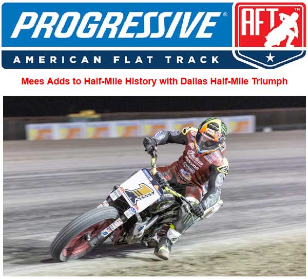 | DAYTONA BEACH, Fla. (April 22, 2023) – Reigning Grand National Champion Jared Mees (No. 1 Indian Motorcycle/Rogers Racing/SDI Racing FTR750) penned the latest chapter of a career of Half-Mile heroics with a victorious run in Saturday night’s Mission Dallas Half-Mile presented by Roof Systems at Devil’s Bowl Speedway in Mesquite, Texas.The premier-class king was one-fourth of an early scrap for the lead in the Mission SuperTwins presented by S&S Cycle Main Event, along with a trio of Yamaha-mounted challengers in JD Beach (No. 95 Estenson Racing Yamaha MT-07 DT), Dallas Daniels (No. 32 Estenson Racing Yamaha MT-07 DT), and Dan Bromley (No. 62 Memphis Shades/Corbin/Vinson Construction Yamaha MT-07).The opening stages of the contest proved to be a battle of extreme high and low lines. The high line showed itself to be the fast track up the order initially before giving way to a high-risk, high-reward tight-rope line at the bottom. Just prior to half-distance, Mees and Daniels exploited that tricky low line to break free and settle into a rematch of their Senoia shootout. Meanwhile, Beach and Bromley fell into a five-rider fight for the final spot on the podium after being reeled in by the charging Brandon Robinson (No. 44 Mission Roof Systems Indian FTR750), Davis Fisher (No. 67 Rackley Racing/Bob Lanphere’s BMC Racing Indian FTR750), and Briar Bauman (No. 3 Parts Plus/Jacob Companies KTM 890 Duke). Daniels made a couple of determined attempts to zero in on Mees but never got quite close enough to make a serious attempt at an overtake. A small bobble on the part of Daniels with less than a minute remaining gave the champ a bit of breathing space. He was then ceded even more as his young rival called off the assault to accept second. The triumph was the 34th Half-Mile win of Mees’ historic career, placing him just one shy of the all-time record held by Scott Parker. Afterward, Mees said, “Honestly, this was one of the hardest races to win. Going into Turn 1 and through Turn 2, you had to be so delicate going into the corners. You had to hit your brake mark right, get your throttle position right, and if you messed it up, it screwed your whole momentum up. It was definitely a hard race to win. “Hats off to my entire team. We had a little mess up in Arizona, but we came back pretty strong all day long.” Adding to Mees’ big evening was the misfortune of Beach, who crashed out of podium contention and dropped from second to fourth in the championship standings in the process. Robinson – who wasn’t even sure he’d be able to ride in Dallas after getting banged up in practice crashes at the previous two rounds – earned the final spot on the box. Bauman railed his way around the outside to climb to fourth in the end with Fisher behind in fifth. Bromley ended his impressive run in sixth, while positions 7-10 were filled by Jarod Vanderkooi (No. 20 JMC Motorsports/Fairway Ford Indian FTR750), Bronson Bauman (No. 37 Fastrack Racing/2 Wheelz KTM 890 Duke), Ben Lowe (No. 25 Rackley Racing/Mission Foods Indian FTR750), and Kolby Carlile (No. 36 G&G Racing/Yamaha Racing Yamaha MT-07), in that order. Daniels continues to hold down the championship lead with 113 points in his pocket following his 1-1-2-2-2 start. Mees now ranks second with 96 points, while two-time champ Bauman (78) also edged ahead of Beach (76) for third. Parts Unlimited AFT Singles presented by KICKERTrent Lowe (No. 48 American Honda/Mission Foods CRF450R) can finally call himself a Parts Unlimited AFT Singles presented by KICKER Main Event winner after repeatedly knocking on the door of that landmark achievement for years.Lowe’s maiden Progressive AFT victory headlined a race that represented a monumental reversal of fortune compared with the four that led into it. After getting off to a slower-than-expected start to the season, the American Honda-backed Turner Racing team entered the day with just one podium between its talented trio of Lowe, Morgen Mischler (No. 13 American Honda/Mission Foods CRF450R), and Chase Saathoff (No. 88 American Honda/Mission Foods CRF450R). They tripled that number in a single outing in Dallas after fighting back in furious fashion at Devil’s Bowl Speedway. The three immediately went to the front and turned the first half of the race into a glorified poster shoot for the team, running side-by-side-by-side with the field struggling to stay in their wake. Lowe eventually shook free while the pack closed in on second-placed Saathoff and third-placed Mischler, but they ultimately held strong to secure the podium lockout. Lowe said, “I’m so happy, and I think the entire team is so happy – it’s going to be a party in our pit area tonight. The whole Turner Racing team pulled it together. We were kind of on the struggle bus at the beginning of the season, but we definitely made a big improvement on this one with the three of us on the podium. I can’t thank the team enough.” Meanwhile, the championship’s usual suspects struggled mightily before finally coming good in the end. Defending champ Kody Kopp (No. 1 Red Bull KTM Factory Racing 450 SX-F) ran as low as eighth, while Dalton Gauthier (No. 79 D&D Racing/Certified KTM 450 SX-F) and Max Whale (No. 18 Red Bull KTM Factory Racing 450 SX-F) found themselves buried outside the top ten. Kopp and Whale finally found their groove, weaving their way up through the field with Kopp earning fourth at the checkered flag, just 0.172 seconds short of the podium. Aussie Whale came home just behind his teammate, outdueling Trevor Brunner (No. 21 Estenson Racing Yamaha YZ450F) to complete the top five. Meanwhile, Gauthier executed a charge of his own to finish in seventh, while Chad Cose (No. 49 1st Impressions Race Team/Husqvarna Racing FC450), Shayna Texter-Bauman (No. 52 Parts Plus/Jacob Companies KTM 450 SX-F) and Brunner’s Estenson Racing Yamaha teammate Tom Drane (No. 59 Estenson Racing Yamaha YZ450F) rounded out the top ten. As