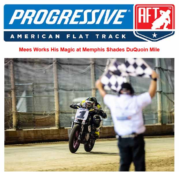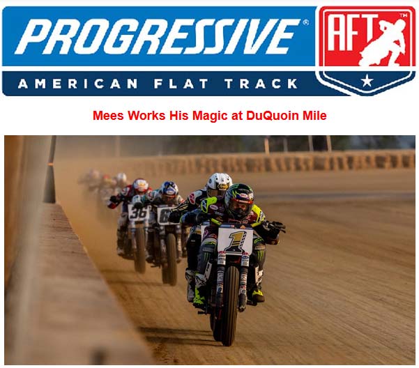 Saturday night’s DuQuoin Mile. Progressive American Flat Track, sanctioned by AMA Pro Racing, finally made its much-awaited return to DuQuoin State Fairgrounds in DuQuoin, Illinois, and the “Magic Mile” did not disappoint. Reigning Mission SuperTwins presented by S&S Cycle king Mees was forced to pull another rabbit out of his helmet after going back and forth for 12 minutes plus two laps with the superstar trio of Dallas Daniels (No. 32 Estenson Racing Yamaha MT-07 DT), Briar Bauman (No. 3 Parts Plus/Jacob Companies KTM 790 Duke), and Brandon Robinson (No. 44 Mission Roof Systems Indian FTR750). The four swapped positions throughout with none showing an obvious edge. And all four were within touching distance as they exited Turn 2 for the final time, operating almost as if a single entity. But somehow, someway, Mees once again put his name at the top of the results sheet after the pack stormed past the checkered flag. Adding to Mees’ joy was the fact that runner-up Robinson slotted between the winner and points leader Dallas Daniels (No. 32 Estenson Racing Yamaha MT-07 DT), with the Estenson ace pushed outside the top two for the first time all season long despite taking the checkered flag just 0.097 seconds behind Mees. The victory was the 26th Mile win of Mees’ career, breaking a tie with icons Bubba Shobert and Bryan Smith to claim sole possession of third place on the all-time order. He said “This track is so much fun. At the start of the race and in the mid-part, I wasn’t really in my groove; I was spinning it up bad, and I just didn’t have good roll corner speed. I just kind of sat back and saw Briar had some really good lines. I kind of copied some of his stuff and moved around and found home. Hats off to my entire crew for working their butts off and giving me the best motorcycle possible. “I’m really stoked to have won the DuQuoin Mile. I’m happy to have gotten this one off the list.” It was almost unfair, then, that Bauman wasn’t rewarded with a trip to the podium. Despite finishing fourth, the Main Event was his most competitive ride to date on the developing Rick Ware Racing KTM, having led multiple laps and been in with a shot at victory to the very end. Fifth place, meanwhile, was taken in a close fight by JD Beach (No. 95 Estenson Racing Yamaha MT-07 DT) over Davis Fisher (No. 67 Rackley Racing/Bob Lanphere’s BMC Racing Indian FTR750), the two finishing just under six seconds back of Mees. They had done all they could to make it a six-rider tilt at the front during the race’s early stages, with Fisher momentarily joining the lead pack before falling back into the clutches of Beach. Seventh went to Jarod Vanderkooi (No. 20 JMC Motorsports/Fairway Ford Indian FTR750) in another duel for position, this one with Bronson Bauman (No. 37 Fastrack Racing/2 Wheelz KTM 790 Duke), while Dan Bromley (No. 62 Memphis Shades/Corbin/Vinson Construction Yamaha MT-07) and Kolby Carlile (No. 36 G&G Racing/Yamaha Racing Yamaha MT-07) rounded out the top ten. Daniels’ perfect podium record still has him leading in the points, but the streaking Mees is now within single digits in second, moving to within nine points of the first (198-189) as the season reaches its halfway point. Parts Unlimited AFT Singles presented by KICKER The prodigious Tom Drane (No. 59 Estenson Racing Yamaha YZ450F) came out on top of a race-long six-rider dogfight for top honors in an unforgettable Parts Unlimited AFT Singles presented by KICKER Main Event. From the very beginning of the contest, it was evident the checkered flag would be decided between Drane, Chase Saathoff (No. 88 American Honda/Mission Foods CRF450R), Trent Lowe (No. 48 American Honda/Mission Foods CRF450R), Max Whale (No. 18 Red Bull KTM Factory Racing 450 SX-F), Kody Kopp (No. 1 Red Bull KTM Factory Racing 450 SX-F), and Trevor Brunner (No. 21 Estenson Racing Yamaha YZ450F). The six factory-backed pilots immediately separated at the front and just as quickly determined they could not separate from one another. Saathoff controlled the pace from the bottom-line for much of the race. But as the minutes ticked away, that control became more and more tenuous as Lowe, Drane, and Whale all took their turns at the front of the group. Drane actually ran in sixth with less than a minute to go but blasted past fellow Aussie Whale to reclaim the lead as the decisive final two laps kicked off. The Estenson pilot managed to hold that position to open the final lap but saw Saathoff dive underneath entering Turn 3, while Lowe powered by both exiting 4. But Drane nudged back ahead as the pack swarmed to the checkered flag, beating Saathoff to the line by a mere 0.011 seconds, followed fractionally by Lowe in third. Whale was just 0.081 seconds off the win but relegated to fourth, with Kopp and Brunner completing the top six in that order and meters away from victory themselves. After the race, Drane said, “It’s so good… We’ve been working so hard all season and to get my second win is awesome. All these people from Australia are here tonight, and they’ve all been helping me. It’s so cool.” Third Turner Racing pilot Morgen Mischler (No. 13 American Honda/Mission Foods CRF450R) registered a lonely race to seventh. He finished some three-and-a-half seconds off the win after coming up short in an early bid to track the lead pack down. Dalton Gauthier (No. 79 D&D Racing/Certified KTM 450 SX-F) won out in a three-rider battle for eighth waged another six seconds back of Mischler. The ‘19 class champ narrowly defeated 1st Impressions Husqvarna teammates Chad Cose (No. 49 1st Impressions Race Team/Husqvarna Racing FC450) and James Ott (No. 19 1st Impressions Race Team/Husqvarna Racing FC450), who rounded out the top ten, respectively. Reigning champ Kopp continues to lead the way in his title defense. However, Saathoff has drawn that much closer thanks to a fifth consecutive podium finish and is now just nine points behind i
