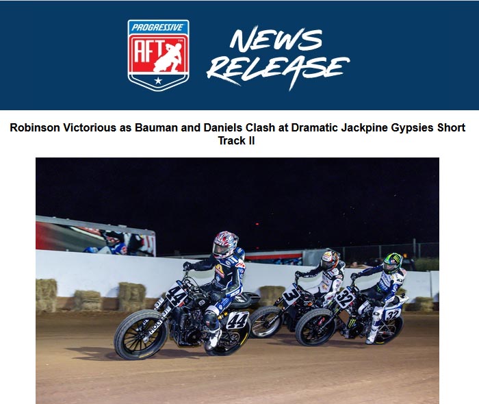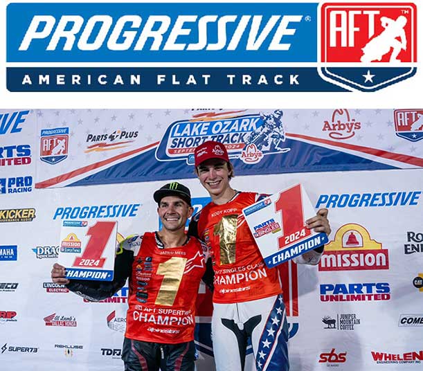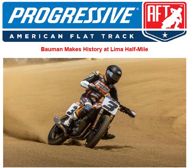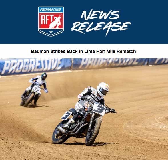 and Drag Specialties at the Allen County Fairgrounds in Lima, Ohio. Following an often challenging half-season spent developing an all-new racebike for an all-new team, Bauman kicked off the second half of 2023 by claiming the first premier-class victory for a KTM twin in the history of Progressive American Flat Track, sanctioned by AMA Pro Racing. And that win came at the conclusion of a thrilling Mission SuperTwins presented by S&S Cycle Main Event. Bauman, who earned the crown in 2019 and 2020, spent all ten minutes plus two laps embroiled in a non-stop dogfight with the rider who currently has the inside track on this year’s title, Dallas Daniels (No. 32 Estenson Racing Yamaha MT-07 DT). Bauman and Daniels alternated high and low lines as theft continually swapped the lead, running side-by-side when one or the other wasn’t making a futile attempt to shake loose at the front. And all the while, their engagement threatened to transform the race for the win into a three-rider affair with reigning king Jared Mees (No. 1 Indian Motorcycle/Rogers Racing/SDI Racing FTR750) lurking right around one second back and just waiting for his chance to strike. Finally, with less than minute to go, Bauman seized the upper hand and then refused to allow Daniels a last-gasp bid to steal away his hard-earned win for Rick Ware Racing. The emotion of the victory was further amplified as Bauman reflected on both the recent passing of his mother as well as his triumphant performance at the scene of his maiden Mission SuperTwins win. He said, “I think these guys are probably going to start making fun of me because I think I cry every time I win. But aside from all that, my brother (Bronson) and I lost our mom six months ago last Sunday, and this is where I got my first Twins win. The love that everyone gives in this sport no matter how hard you’re going up against one another… We’re fighting for everything we can get. I just appreciate all these guys a lot more than maybe I used to. “There are so many people who have supported us. To actually get this done… It’s an honor to be a part of this program. I’m just proud, and I know my mom is proud. We did it.” Last year’s Lima HM winner, Brandon Robinson (No. 44 Mission Roof Systems Indian FTR750), outlasted JD Beach (No. 95 Estenson Racing Yamaha MT-07 DT) as the two finished fourth and fifth, respectively, just over eight seconds behind the fight for the win. Sixth went to Bronson Bauman (No. 37 Fastrack Racing/2 Wheelz KTM 790 Duke), who quietly earned his best result yet aboard the Fastrack KTM. Just behind in seventh and eighth were Davis Fisher (No. 67 Rackley Racing/Bob Lanphere’s BMC Racing Indian FTR750) and Jarod Vanderkooi (No. 20 JMC Motorsports/Fairway Ford Indian FTR750). Kolby Carlile (No. 36 G&G Racing/Yamaha Racing Yamaha MT-07) finished ninth, while Johnny Lewis (No. 10 Moto Anatomy X Powered by Royal Enfield 650) completed the top ten in his return to action even after suffering an ugly heat race crash earlier in the evening. Despite falling short of victory, Daniels maintained his season-long perfect podium record and picked up some points in the title fight in the process. He now leads Mees by 12 points (219-207), while Bauman has moved ahead of Beach to take control of third (166-161). Parts Unlimited AFT Singles presented by KICKER Reigning Parts Unlimited AFT Singles presented by KICKER champ Kody Kopp (No. 1 Red Bull KTM Factory Racing 450 SX-F) notched up a timely victory on a night that proved to be a huge boon for his title defense. Kopp came to Lima as the odds-on favorite due to his performance here a year ago, along with his general Half-Mile mastery, but this one did not come easily. Kopp took the holeshot but soon found himself in second and losing ground to rising star Tom Drane (No. 59 Estenson Racing Yamaha YZ450F). The KTM ace regrouped and successfully countered Drane’s bid to shake free, clawing his way back to the Australian at mid-distance. The two then wove the lead back-and-forth with around three minutes remaining on the clock before Kopp finally got a firm grip on the position. He then stretched open his advantage as the two slithered through lapped traffic, ultimately claiming his fourth victory of the season with more than two seconds in hand. “That was a tough one,” Kopp said. “I got a good start and led it for a couple laps, but Tom is so fast on this stuff, it’s really underrated. We had a heck of a fight, and it was really fun. A lot of hard work went into this one. Those last three Miles were really frustrating as a team in general, but we never gave up and we’re here to fight for a championship.” Kopp and Drane were joined on the podium by the resurgent James Ott (No. 19 1st Impressions Race Team/Husqvarna Racing FC450), who fought off second factory KTM pilot Max Whale (No. 18 Red Bull KTM Factory Racing 450 SX-F) to register his second trophy-earning ride of the season. Drane’s teammate, Trevor Brunner (No. 21 Estenson Racing Yamaha YZ450F), rounded out the top five. Kopp’s championship outlook was further enhanced by the misfortune of Chase Saathoff (No. 88 American Honda/Mission Foods CRF450R), who entered the weekend having closed to within ten points of the title leader. That advantage is significantly greater now, as Saathoff’s momentum was slammed to a halt by a mechanical DNF suffered while running in third position. Kopp’s lead more than tripled as a result, expanding from just nine points to 29 (191-162). His closest challenger shifted as well, with Whale taking over second from Saathoff, who is now ranked third with 158 points after being credited with 19th place in the Main |