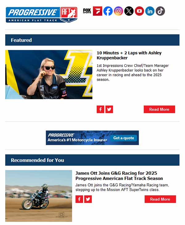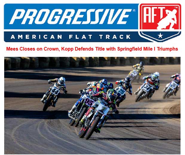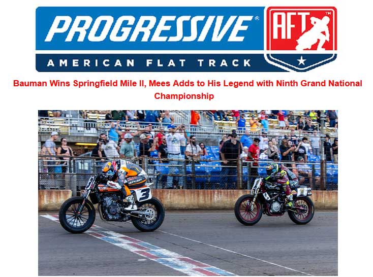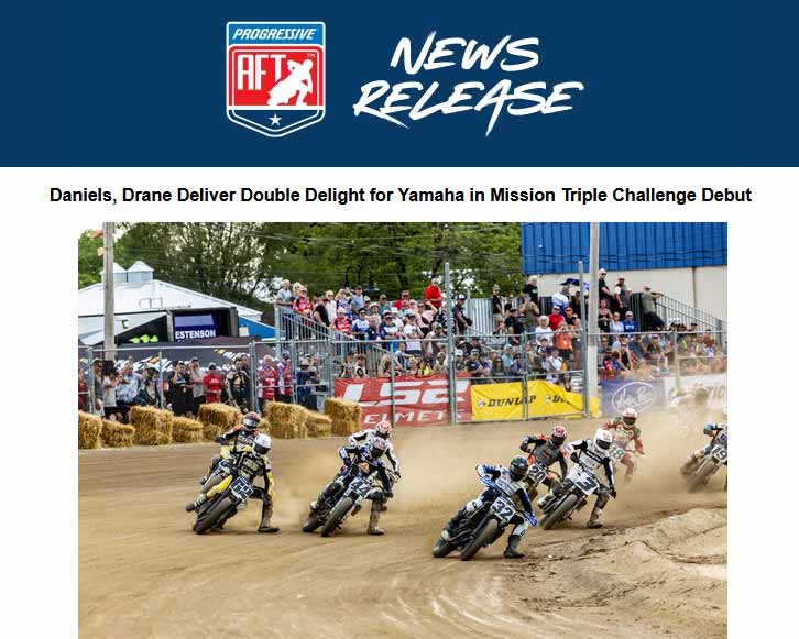 Progressive American Flat Track season, sanctioned by AMA Pro Racing. Home-state hero Dallas Daniels (No. 32 Estenson Racing Yamaha MT-07 DT) fought through adversity to come up huge in the clutch and reignite his Mission AFT SuperTwins title hopes at the Illinois State Fairgrounds in Springfield, Illinois. Last Chance Qualifier Things got mighty serious even before the first Main Event of the Mission Triple Challenge. A deep field packed with some high-profile recent retirees and part-timers – including the legendary Jared Mees (No. 1 Howerton Motorsports Kawasaki Ninja 650), Jeffrey Carver, Jr. (No. 123 Happy Trails Racing, Carver's BBQ Kawasaki Ninja 650), Brandon Price (No. 92 HRP Racing/Duffs Speed Machine Yamaha MT-07), and Henry Wiles (No. 911 1st Impressions Racing KTM 790 Duke) – pushed some of the class’ leading riders into the Last Chance Qualifier during qualifying. That list included title leader Briar Bauman (No. 3 RWR/Parts Plus/Latus Motors Harley-Davidson XG750R), who managed to survive that near scare with a narrow victory over Max Whale (No. 18 Moto Anatomy X Powered by Royal Enfield 650) in the LCQ. Fifth-ranked Jarod VanDerKooi (No. 20 Fastrack Racing/Wally Brown Racing KTM 790 Duke) wasn’t so fortunate, dropping out of a qualifying position with mechanical woes on the race’s final lap. Even worse, he was soon joined by fourth-ranked Davis Fisher (No. 67 Rackley Racing/Bob Lanphere’s BMC Racing KTM 790 Duke), who had dibs on the lone provisional starting slot due to his superior championship positioning. That advantage was awarded via the tiebreaker, as both riders came into Springfield all even at 158 points. Main Event 1 The new-for-‘25 Mission Triple Challenge format, which features three successive Main Events – a 10-lap sprint, a 15-lapper that pays double points, and a final 20-lap Main which concludes the meeting with triple points – was employed for the third and final time this season on Saturday at Springfield. However, it didn’t include one of its designers – 10-time Grand National Champion Mees – as his day ended prematurely; transmission issues encountered during qualifying ruled him out before he could even take the grid for Main Event 1. With the modern-day Springfield master removed from the equation – as well as Fisher, whose backup bike went up in smoke early in Main Event 1 – Daniels jumped into first off the line. However, Carver and Trent Lowe (No. 48 American Honda/Progressive Insurance Honda Transalp) soon took control at the head of a seven-rider pack. But just when it looked like they might escape into a fight of their own, they were tracked down by James Ott (No. 19 G&G Racing Yamaha MT-07) who promptly beat them both to the checkered flag. Daniels held on for fourth, followed by Price, and Brandon Robinson (No. 44 Mission Roof Systems Harley-Davidson XG750R). Bauman finished seventh despite crossing the stripe just 0.836 seconds behind Ott. Main Event 2 Main Event 2 brought the action early and never relented. From the start, a four-rider lead pack formed featuring Carver, Ott, Lowe, and Price, followed by a heavy-hitting next pack consisting of Daniels, Bauman, Robinson and Declan Bender (No. 70 Memphis Shades/Corbin/OTB Racing Yamaha MT-07) about a second behind. The race’s shape was upended when Carver bumped the elbow of Ott while attempting to take the lead, instantly transforming the contest into an eight-rider battle for the win. At that point, title leader Bauman made his move, working his way up to the lead on the final lap. While he was ultimately unable to fend off Lowe – who put the Honda Transalp on top of the box – he did hold on for second while rival Daniels could only manage seventh. Price finished third, followed by Bender, Ott, and Robinson. Following his moment with Ott, Carver came home behind Daniels in eighth. Main Event 3 A tense and enthralling Main Event 3 closed things out with massive championship implications. Once Main Event 2 winner Lowe dropped out with a mechanical, the 20-lapper took shape as a five-rider fight at the front with Harley-Davidson-mounted Bauman faced up against the Yamahas of Daniels, Bender, Ott, and Price. Bauman repeatedly featured in first, slicing his way back through whenever Bender and Ott – and later Daniels and Price – clawed their way forward. However, Bauman’s brilliant riding was overmatched by sheer speed when it mattered the most. Despite leading with two laps to go, Bauman lost out in the final shuffle; he was dropped all the way down to fifth at the flag while rival Daniels blasted up to hit the stripe in first. Price finished second (0.092 seconds), followed by Ott (0.146), Bender (0.183), and Bauman (0.194). And with triple points in effect, that re-racked the day’s Overall results in nearly in that same order, with Bauman ahead of Bender for fourth the only alteration. As a result, Bauman’s championship lead has been reduced to just two points (280-278) with just only races remaining. Robinson remains third at 186. An emotional Daniels said, “The beginning of the day today has just been the story of the season. It’s been tough, but I’ll tell you one thing, it’s making us a helluva lot stronger. We proved that we don’t give up. That’s the motto for sure. I kind of had my head down after the second Main Event, and my dad grabbed me and said, ‘Hey dude, we’re not out of this.’ “Briar was so good in (Turns) 3 and 4, I was just nervous. I didn’t know where to place myself. But when Brandon (Price) got up there, I knew it was time to go. On the last lap, I knew I had to cut the best Turns 3 and 4 I did all day, and I really felt I did. Winning the Springfield Mile is pretty cool.” AFT Singles presented by KICKER Australian Tom Drane (No. 59 Estenson Racing Yamaha YZ450F) became the first non-American champion in any class in the long history of Progressive American Flat Track, securing the AFT Singles presented b
