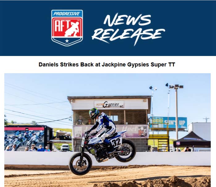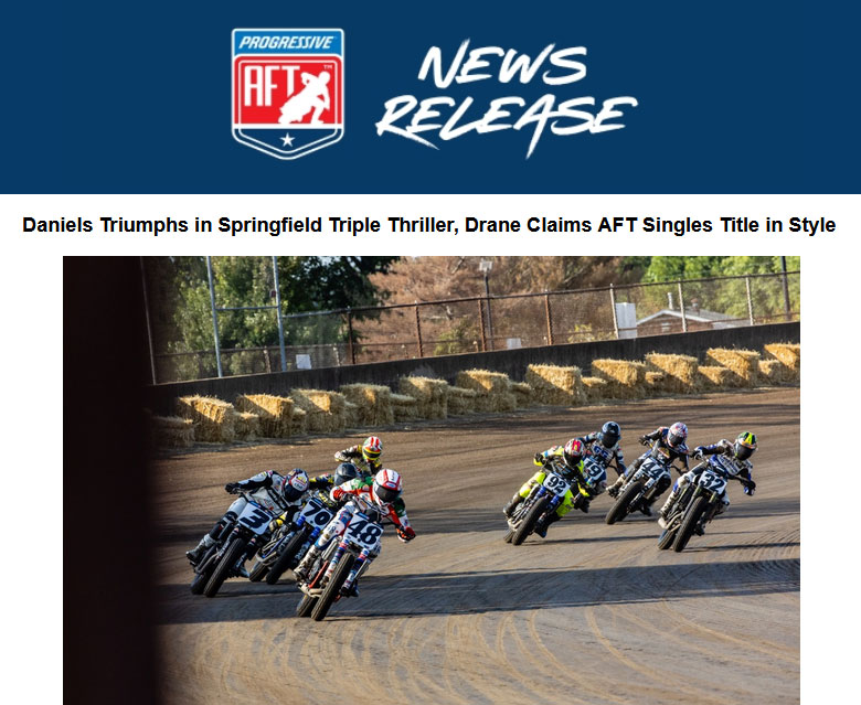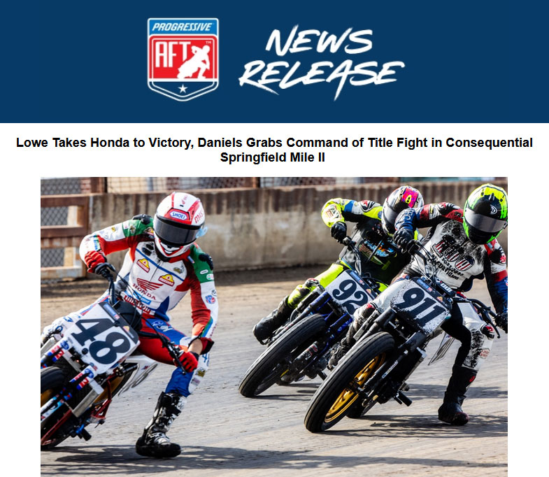 Flat Track season, sanctioned by AMA Pro Racing. Lowe dove past long-time leader Dallas Daniels (No. 32 Estenson Racing Yamaha MT-07 DT) entering Turn 3 on the race’s final lap and then held off the Mission AFT SuperTwins title contender by a scant 0.026-second margin at the checkered flag. Despite that minor disappointment, it was still a huge day for Daniels at the Illinois State Fairgrounds in Springfield, Illinois, when taking the bigger picture into consideration While seven riders finished within a second of the win, three of the race’s most significant figures weren’t included among them. Early leader Jeffrey Carver, Jr. (No. 123 Happy Trails Racing, Carver's BBQ Kawasaki Ninja 650) was the first to pull out with mechanical issues. He was joined a few minutes later by AFT Singles champ Tom Drane (No. 59 Estenson Racing Yamaha MT-07 DT), who was ensconced in the lead pack in his premier-class debut before being forced out with problems of his own. Moments later – and most consequentially of all – then-Grand National Championship leader Briar Bauman (No. 3 RWR/Parts Plus/Latus Motors Harley-Davidson XG750R) was black-flagged while racing up front as a result of smoke that billowed from his machine. Daniels’ runner-up, combined with Bauman being credited in 14th, completely alters the championship outlook with just a single race remaining. The Estenson Racing Yamaha rider now leads his Rick Ware Racing Harley rival by 13 points with only 23 points left in play. That means even if Bauman wins the finale, Daniels needs to finish just seventh or better in order to defeat him for the ‘25 Mission AFT SuperTwins crown. Despite that shift, this day belongs to Lowe, who delivered the Big Red SuperTwins program its first win since kicking off the initial development of a Honda Transalp-based racebike ahead of the 2024 season. It was also the first for Lowe, who had already made a strong impression in his first full premier-class season. The Indiana native’s win was the first for a Honda twin-cylinder since Rich King claimed victory at the 1998 Joliet Half-Mile aboard a Honda RS750. It was also the first such podium since King finished second at the Springfield Mile later that same year. Honda’s last win of any kind in the premier-class came back in 2016 with Jake Johnson riding a Honda CRF450R at the DAYTONA Short Track II. Afterward, Lowe said, “First and foremost, I want to thank my whole team. I’ve been a little bit of a pain, but there has to be a little bit of conflict in the pit area just to kind of get everything going. I’m serious, they’re serious. We all want to figure this out. “I have to give a huge shout out to Mission Foods, Jerry Stinchfield, Mike Turner and the whole Turner family, Steve Watt, Kenny Coolbeth, Randy Triplett, Mike Lozano, the whole Maxwell Industries crew, and Al Lamb’s Dallas Honda… I’m just so thankful for this. These guys put so much into this. It just means a lot to finally get one here.” Meanwhile, Brandon Price (No. 92 HRP Racing/Duffs Speed Machine Yamaha MT-07) closed out a remarkable comeback weekend with a third to add to yesterday’s runner-up. He was followed closely to the line by Declan Bender (No. 70 Memphis Shades/Luczak Racing Yamaha MT-07), Henry Wiles (No. 911 1st Impressions Racing KTM 790 Duke), and Brandon Robinson (No. 44 Mission Roof Systems Harley-Davidson XG750R). Davis Fisher (No. 67 Rackley Racing/Bob Lanphere’s BMC Racing KTM 790 Duke) was the last rider to finish in the lead pack, just 0.548 seconds off the win yet relegated to seventh in the final order.  AFT Singles presented by KICKER With the 2025 championship already decided, the AFT Singles presented by KICKER category simply delivered a Springfield Mile classic. A huge pack of riders went bar-to-bar for ten minutes plus two laps, with 11 riders taking the checkered flag within a second of victory. But despite the extraordinarily close margin, victory once again belonged to the newly crowned class king, Tom Drane (No. 59 Estenson Racing Yamaha YZ450F). The Australian cemented his reputation as a young master of the Springfield Mile, now boasting five wins in the last six AFT Singles Main Events contested at the venue (and that’s even after compacting yesterday’s 1-1-1 into a single victory). Other than a single, momentary stint outside the top five, Drane factored heavily at the front throughout, trading the lead with fellow front-row runners Trevor Brunner (No. 21 American Honda/Mission Foods CRF450R), Chad Cose (No. 49 1st Impressions Race Team Husqvarna FC450), and polesitter Kage Tadman (No. 288 1st Impressions Race Team Husqvarna FC450). Meanwhile, Jared Lowe (No. 63 Big R/Little Debbie Racing Honda CRF450R), Bradon Pfanders (No. 83 Hannum’s HD/Pfanders Racing KTM 450 SX-F), and Tyler Raggio (No. 55 Raggio/Sluggo/Unsettled Racing KTM 450 SX-F) poked at them from meters behind, with Walker Porter (No. 100 American Honda/Mission Foods CRF450R), Aidan RoosEvans (No. 26 FRA Trust/ATV’s and More Yamaha YZ450F), Hunter Bauer (No. 24 Vinson Construction/Reel Medics Yamaha YZ450F), and Ryder Reese (No. 244 Mission Foods Roof Systems) a double draft away from pulling the upset. Despite the seeming unpredictability of the contest, Drane calmly positioned himself where he needed to be on the final lap, pulling in behind late leader Brunner as the pack negotiated the race’s final two corners. The Estenson Racing star pulled out at just the right moment, soaring past in time to grab the checkered flag by 0.028 seconds over the Turner Honda pilot. “I’ve had a really good run here,” Drane said. “Ever since we first came here in ‘22, I’ve always done well here. I had a great bike underneath me, which really helped. Big thanks to my whole Estenson Racing Monster Energy team. They’ve put in a lot of work and given me a really fast bike. It’s been amazing. We’ve had a really good year.” Cose edged teammate Tadman once agai