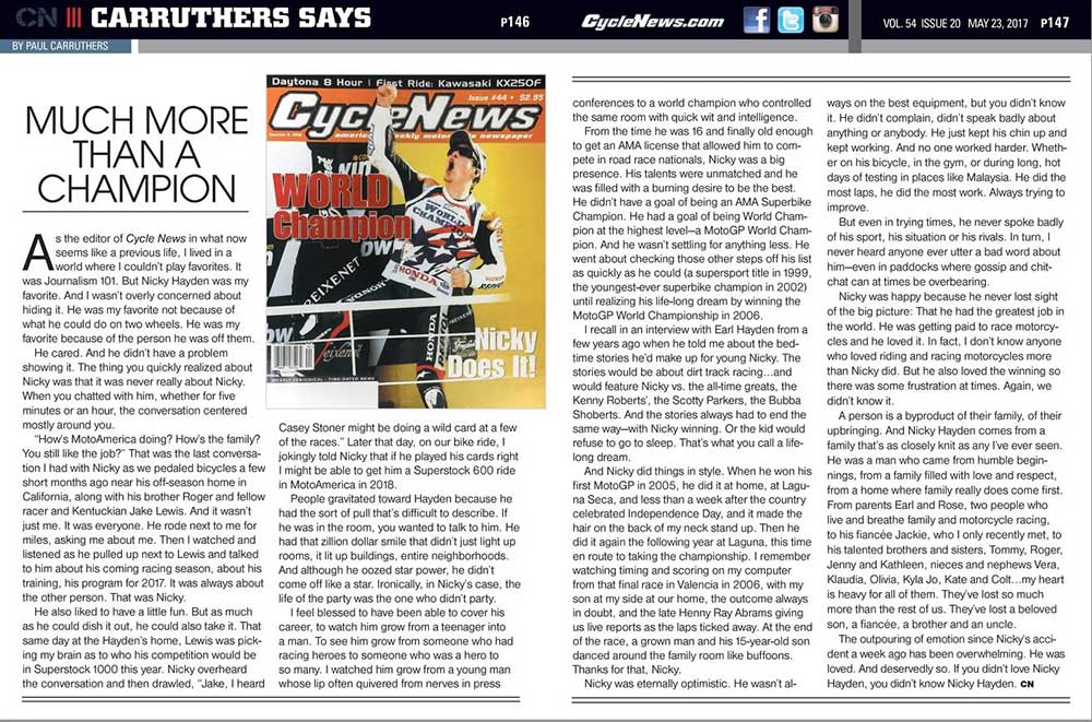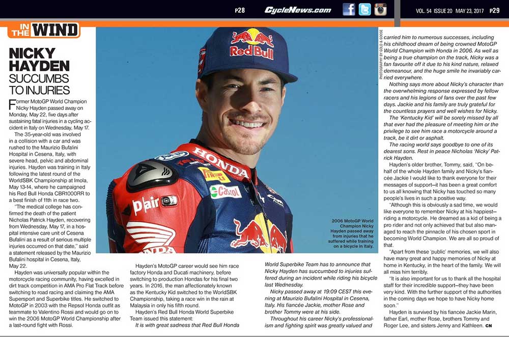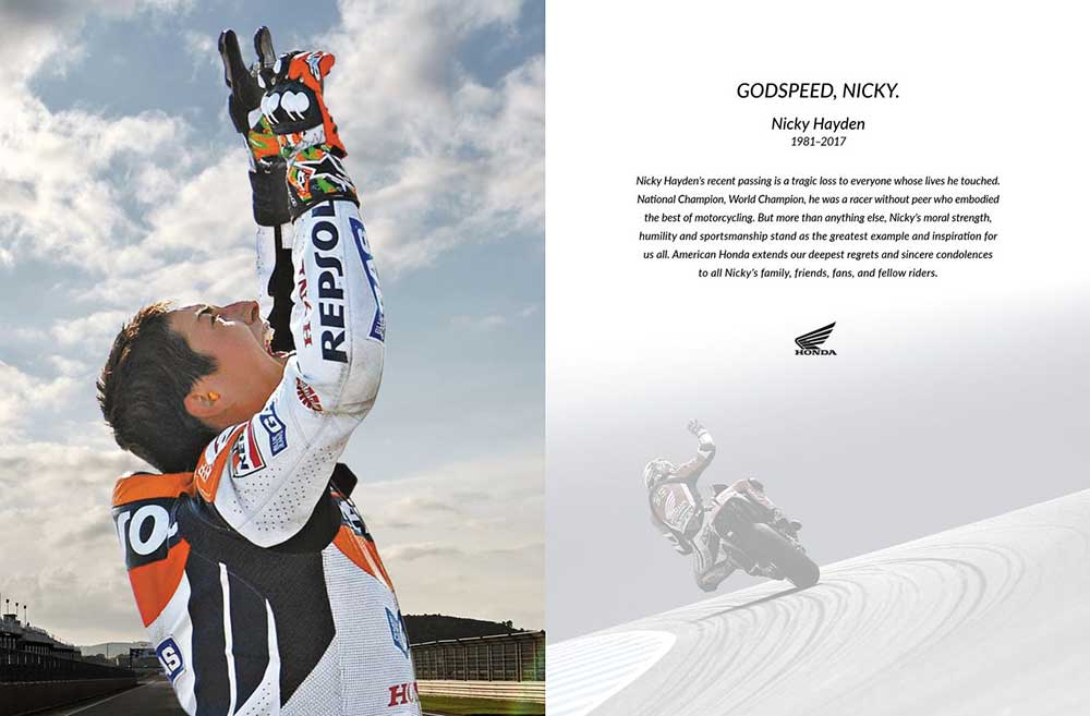 DAYTONA BEACH, Fla. (May 22, 2017) - The American Flat Track community is left in mourning following the tragic passing of American motorcycle racing legend Nicky Hayden and sends heartfelt condolences to the Hayden family.Nicky's breakout year came in 1999, when he took home his first victory in the Grand National Championship at the Hagerstown Half-Mile and was bestowed American Flat Track Rookie of the Year honors. That same year, as a privateer, he won the AMA Supersport championship and was subsequently named the AMA's Athlete of the Year.Over the next three seasons, Nicky perfected his craft on American dirt tracks and road courses, grabbing five more GNC victories and winning the DAYTONA 200 en route to capturing the 2002 AMA Superbike championship. In 2003, after dominating the American motorcycle racing scene, Honda tapped the rising star to join the elite Repsol Honda team in MotoGP. At 22 years old, the Kentucky Kid was introduced to the world, and his warm personality, smooth style and Southern charm quickly resonated with fans across the globe.Four short years later, Nicky's dreams were realized when the American prodigy captured the Grand Prix World Championship in dramatic fashion, cementing his legacy as the best American motorcycle racer of his generation. |