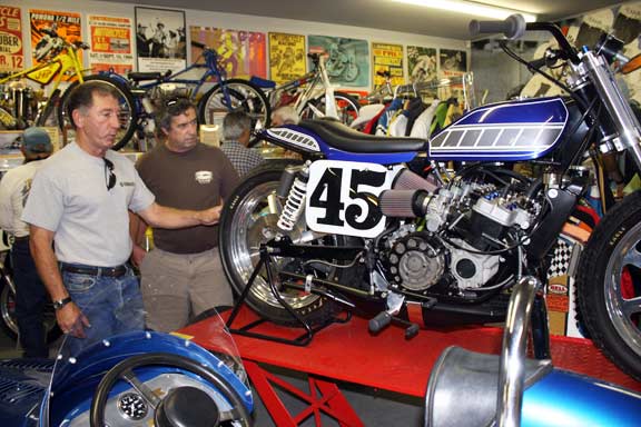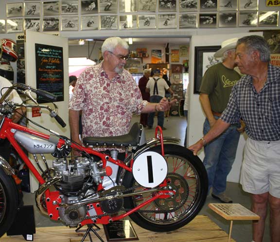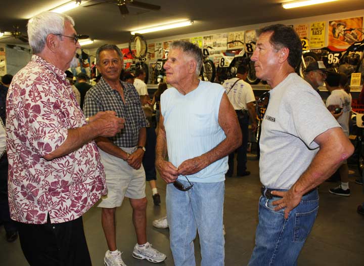 Honored guest Joe Leonard, with good friend Geoge Sepulveda admiring unusual Triumph.