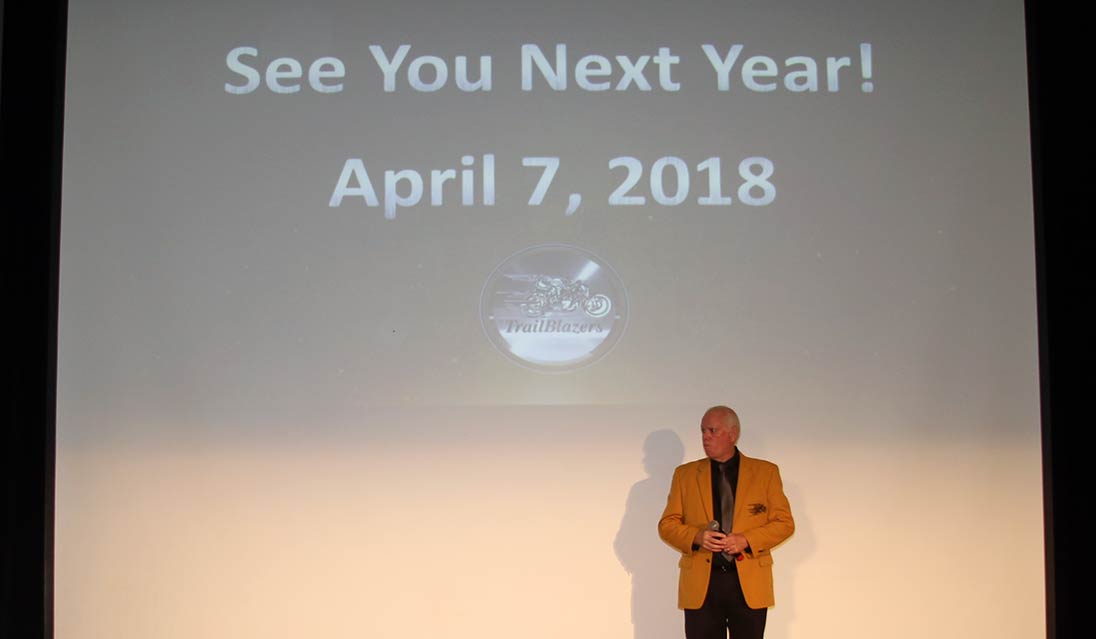 ![]() Trailblazers 73th Annual Banquet Held at the Carson Events Center, Carson, California April 22th, 2017 Tom White and Keith Mashburn Cary Buck, Mark Brelsford, Tom White and Hagerty Insurance representative Kyle Bowen ![]() ![]() Rudy Pock and Nick DiBenedetto receive Hagerty trophies from Kyle Bowen ![]() ![]() ![]() ![]() Don Emde, Keith Mashburn, Larry Huffman and the Agajanian sons toast J.C. Agajanian ![]() ![]() ![]() ![]() Judy Whitson received the Lucile Flanders Award ![]() Hall of Fame inductee Jim Buchanan ![]() Hall of Fame inductee Billy Hamill ![]() Hall of Fame inductee Norm McDonald with Malcolm Smith ![]() Hall of Fame inductee Tony Murphy ![]() Barbara Gorringe accepting for Hall of Fame inductee Gary Preston ![]() Hall of Fame inductee Bill VanTichelt ![]() Dick Hammer Award presented to Dave Ekins ![]() ![]() Dave , Mike Konle and Gene Link to Bike Show![]() |