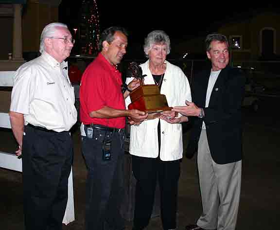 Gene Romero presents Mrs Tom Cates with the Dick Hammer Memorial Trophy.