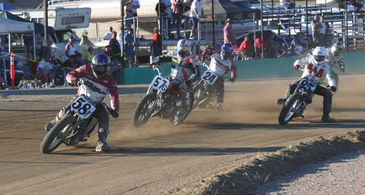 The question has been asked, can anyone stop Mickey Alzola in the Super Senior class? Well, Ken Barrow out of San Diego CA has stepped it up and is giving Mickey some stiff competition. For the "K&N Filters" main Roy Burris hit turn one first followed by former national #11 Jim McMurren, Alzola, and Barrow. Exiting turn four Alzola made a spectacular move from third to first aboard his C&J framed Triumph. By lap two Barrow settled down, moved to a lower line on the track and was up to third, while Burris under attack slid backwards from pressure from Dave Cheney who took over fourth. On lap three Barrow was all over McMurren and would move into second while Alzola out front put in a 23.41/100 second lap. The checkered flag saw the order Alzola (checked out) Barrow, McMurren, Cheney, and Burris.