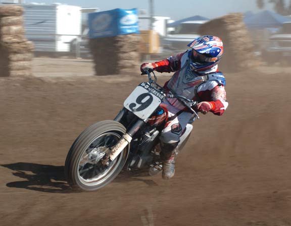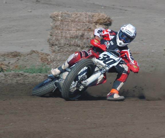 The twenty lap Digger Helm Pro 600 staged for the final race of the night with Fresno H-D's Don Howard and Tucker Rocky/MSR's Mikey Rush thundering into turn one side by side. Rush took point exiting turn two only to have Howard run it up the inside down the back straight, then coming together with Rush between turn three and four hard. Rush amazingly saved it, but was punted wide off the track and had to rejoin in the fifth place position. Of the incident Rush said "it was just racing, I thought it was a little rough, but it's ok." Rodney Spencer Jr. ran second, Jesse Sleeper (who's gotten real fast of late) was third, and Kenny Malaguarnero fourth. By lap four Rush on a mission was by Malaguarnero and Sleeper and up to third. Daniel Brown settled into sixth with Garrett Stout seventh. At the front Howard was getting away while Rush was closing on Spencer. Rush was working the cushion up high and on lap seven found his way past Spencer for second, this the same lap that saw Stout move up to fifth. At the half way point Howard had a two second gap over Rush who had to be spent after his charge forward. By lap fourteen Spencer found some new life and was on the tail of Rush with Sleeper in fourth under attack from Stout. Brown had also exited the race going down in turn four. Mistake free Howard turned his fastest lap of 18.12 seconds as he cruised to the victory with a four second gap over Rush, Spencer was third, Sleeper held off Stout for fourth, and Chris Canepa came from way back to finish sixth.
