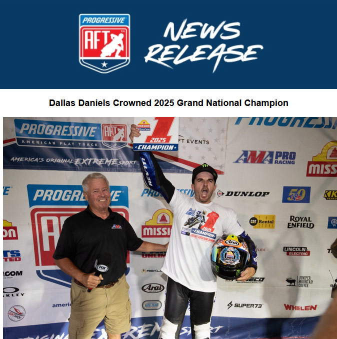 worked my whole life to be here.” While ultimately unable to overcome Daniels’ peerless consistency, Bauman closed out a spectacular season that only further enhanced the reputation of the two-time Grand National Champion. In ‘25, Bauman and his Rick Ware Racing team took the previously winless Harley-Davidson XG750R and won more races than any other rider this season (eight) while giving Daniels and the Estenson Racing squad all they could handle until the very end. Bauman said, “I’ve got to give a huge thanks to the Rick Ware Racing/Parts Plus/Latus Motors team. I ask so much of these guys. We had high hopes and a lot of heart. Congrats to Dallas Daniels and the whole Estenson Racing team. They are so good. This was the best year of my career statistically, and it wasn’t good enough. That’s crazy.” Daniels won the 2025 Mission AFT SuperTwins title with 313 points. Bauman ended up second with 307, followed by Robinson at 217. Meanwhile, Lowe secured Mission AFT SuperTwins Rookie of the Year honors by finishing a superb fourth overall with 186 points. Briar Bauman (3) and Dallas Daniels (32) congratulate each other immediately following the Mission AFT SuperTwins Main Event Saturday night. [Photo: American Flat Track / Tim Lester] AFT Singles presented by KICKER While Tom Drane (No. 59 Estenson Racing Yamaha YZ450F) locked up the 2025 AFT Singles presented by KICKER title two rounds early, there was still much in play at the ‘25 finale. Even with the remainder of the field seeking both personal milestones and momentum to carry into the offseason, Drane continued to own the spotlight. However, earlier in the contest, the rider of ‘25 found himself chasing a couple of riders of the future. Second-year pilot Bradon Pfanders (No. 83 Hannum’s HD/Pfanders Racing KTM 450 SX-F) took the early advantage before being displaced by rookie ace Kage Tadman (No. 288 1st Impressions Race Team Husqvarna FC450). At half-distance, newly crowned champ Drane switched up his line, cutting down low entering Turn 1 and making up big chunks of ground in the process. Once in striking distance, he used the same line to dive under Pfanders to take control of second before attempting to do the same to Tadman in first. The Californian had an answer the first time around, squaring Drane back up to reclaim the lead. However, the Estenson Racing star made it stick on his second attempt. A curveball was thrown moments later in the form of a red-flag reset with just 59 seconds remaining on the clock following a crash on the part of Trevor Brunner (No. 21 American Honda/Mission Foods CRF450R). Even though that development put Tadman back out in front for the staggered restart, Drane immediately slung it low entering Turn 1 to snatch the lead right back. The restart still had significant implications as it thrust a previously quiet Tarren Santero (No. 75 Mission Roof Systems Honda CRF450R) back into the fray near the front. Given new life, Santero nudged ahead of Tadman to take over second. He then subsequently gave Drane a scare to the checkered flag before finishing as the race’s runner-up. Drane’s victory closed out his historic ‘25 campaign with a record-tying eighth win on the season, equaling the previous best marks of Dallas Daniels and Kody Kopp. It also represented his 19th-career win in the class, tying him with Shayna Texter-Bauman for second all-time. His victory also sealed the 2025 AFT Singles Manufacturer crown for Yamaha. Afterward, Drane said, “I can’t thank my whole Estenson Racing Monster Energy team enough. They worked their butts off all year and gave me a great bike. That race, I got to the front earlier, but for the restart, I had to reset my mind. I had to get out there, get the start, and take the lead as quick as I could. Once I was there, I felt I could lead and be comfortable at the front. It was really good.” Tadman held on for third, with Pfanders and Chad Cose (No. 49 1st Impressions Race Team Husqvarna FC450) completing the top five. As a result of tonight’s order, Tadman and Santero ended the season equal with 175 points apiece in their battle for fourth in the final rankings, trailing only the previously decided 1-2-3 of Drane, Brunner, and Chase Saathoff (No. 88 RWR/Parts Plus Honda CRF450R). That position ultimately went to Tadman via the tiebreaker due to his race-winning Progressive AFT debut. Build. Train. Race. Royal Enfield’s Build. Train. Race. (BTR) program, which serves to highlight, celebrate, and encourage the involvement of women in flat track racing, closed out its 2025 season with a double finale at Lake Ozark Short Track. Main Event 1 saw Madicela Rodriguez (No. 113 Royal Enfield/Parts Unlimited) fend off Taia Little (No. 11 Royal Enfield/Parts Unlimited) by a narrow 0.009 seconds at the checkered flag with Emma Gottsch (No. 5 Royal Enfield/Parts Unlimited) less than a second in arrears in third. Little got her revenge in Main Event 2, shaking loose to win ahead of Gottsch and Rodriguez and secure the 2025 BTR championship. |