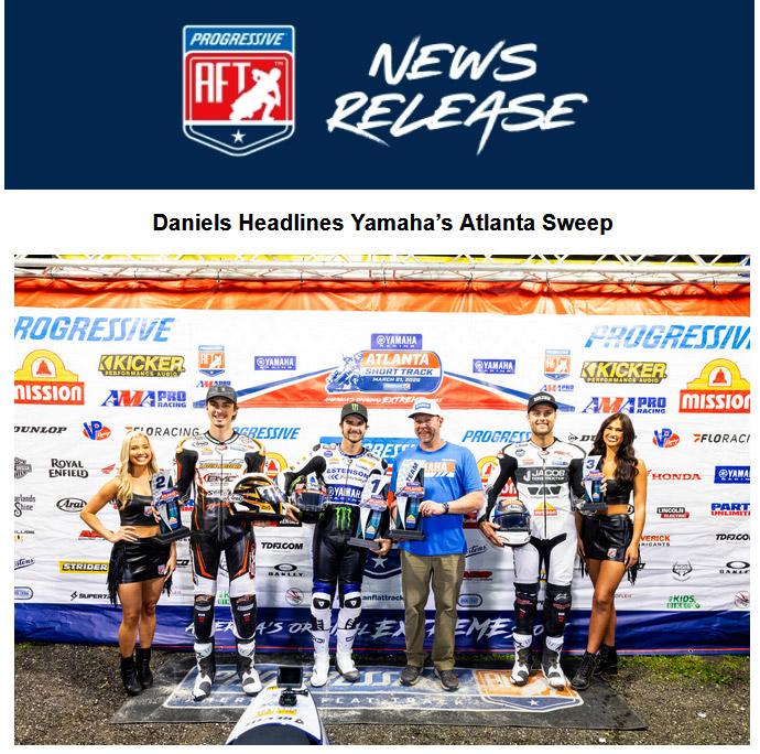 DAYTONA BEACH, Fla. (March 21, 2026) – Reigning Mission AFT SuperTwins king Dallas Daniels (No. 1 Estenson Racing Yamaha MT-07) successfully defended Yamaha’s home turf to complete a clean sweep of victories for the brand in Saturday night’s Yamaha Atlanta Short Track, Round 3 of the 2026 Progressive American Flat Track season, sanctioned by AMA Pro Racing.